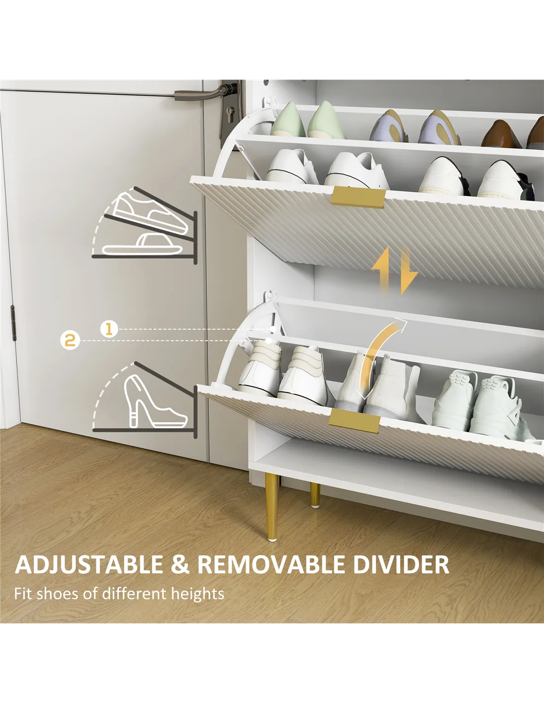 Transform your entryway with the HOMCOM shoe storage cabinet, featuring elegant fluted panel doors and gold tone handles that exude artistic charm. Designed to hold up to 20 pairs of shoes, it keeps your space organised and clutter-free. Adjustable shelves in this shoe rack cabinet accommodate sneakers, boots, or heels, ensuring your footwear stays protected. Elevate your home's style while enjoying a tidy, personalized storage solution.