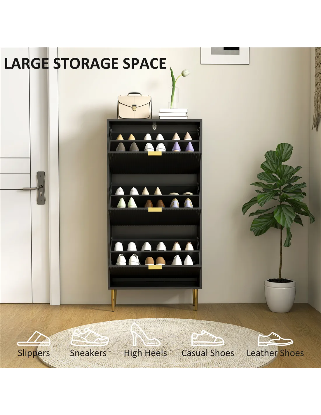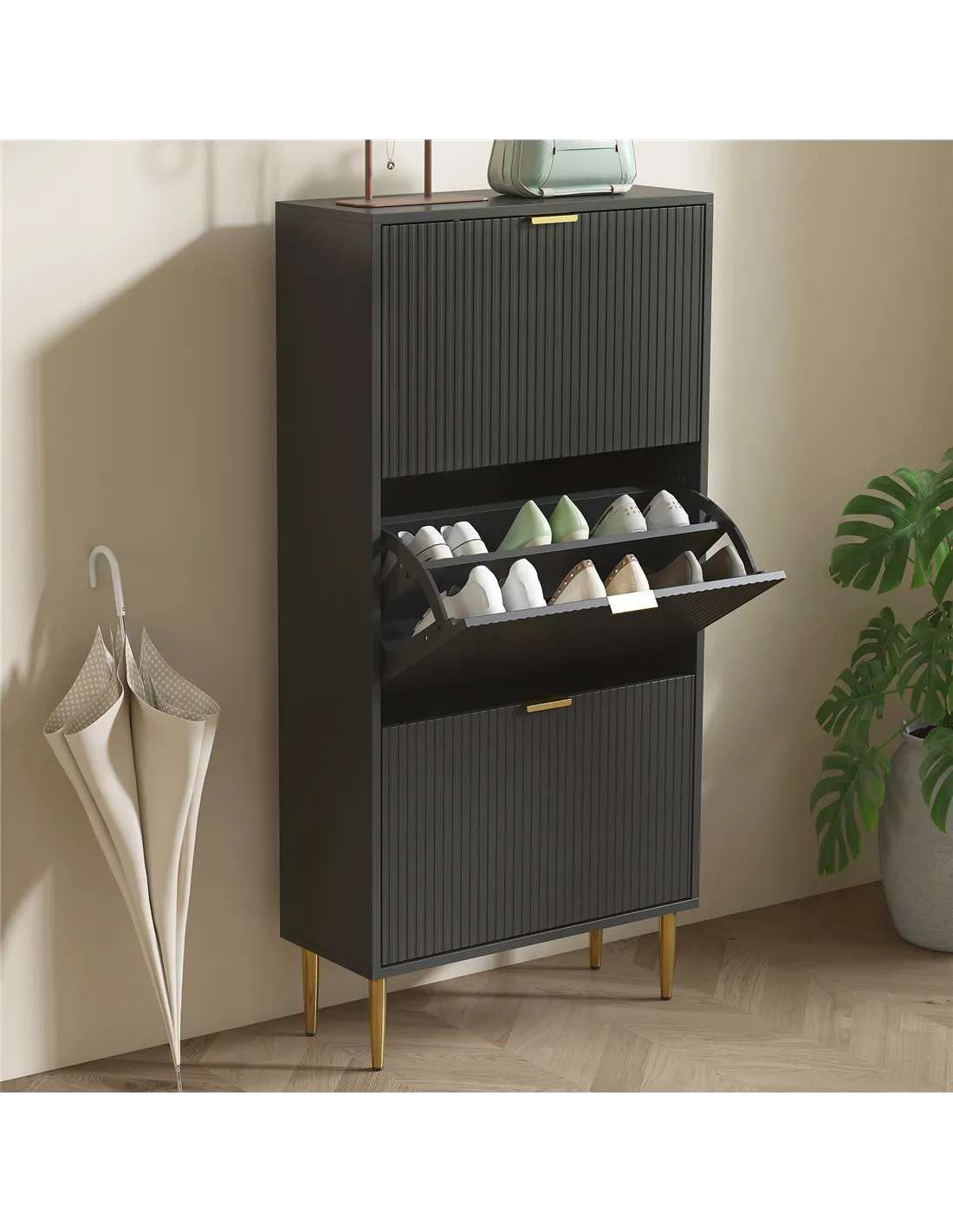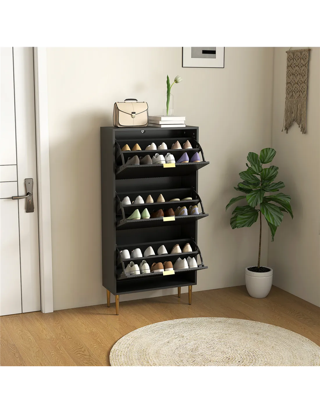 - Three flip drawers can store up to 18 pairs of shoes
