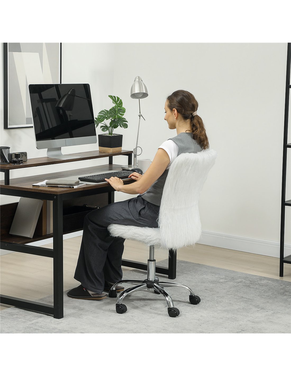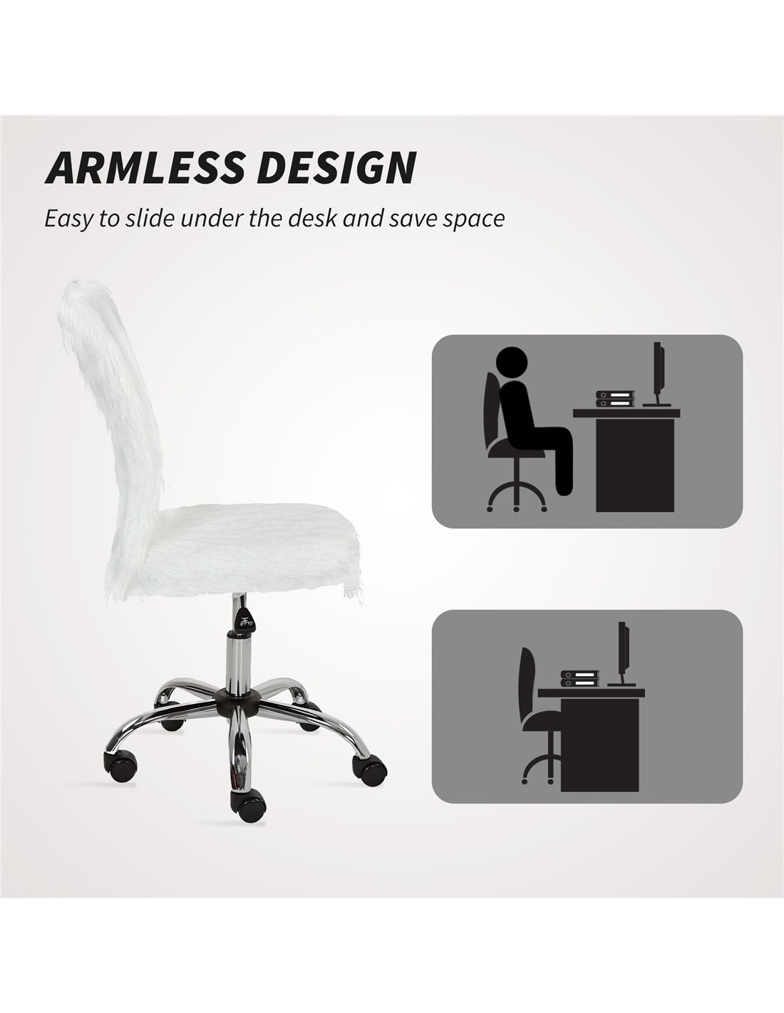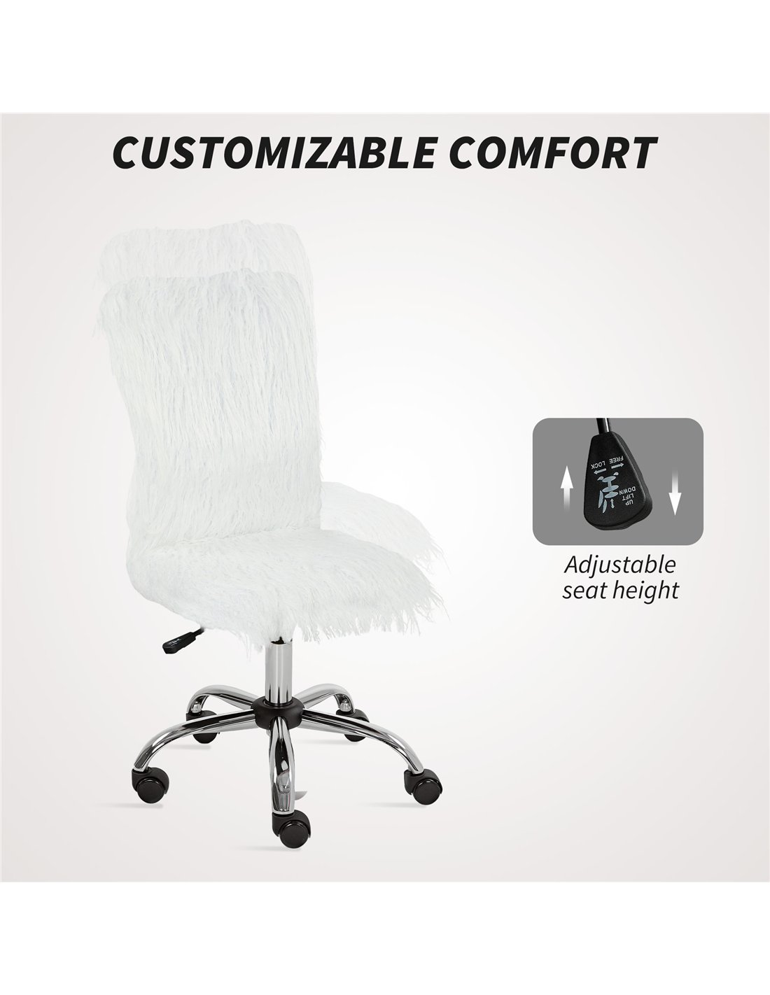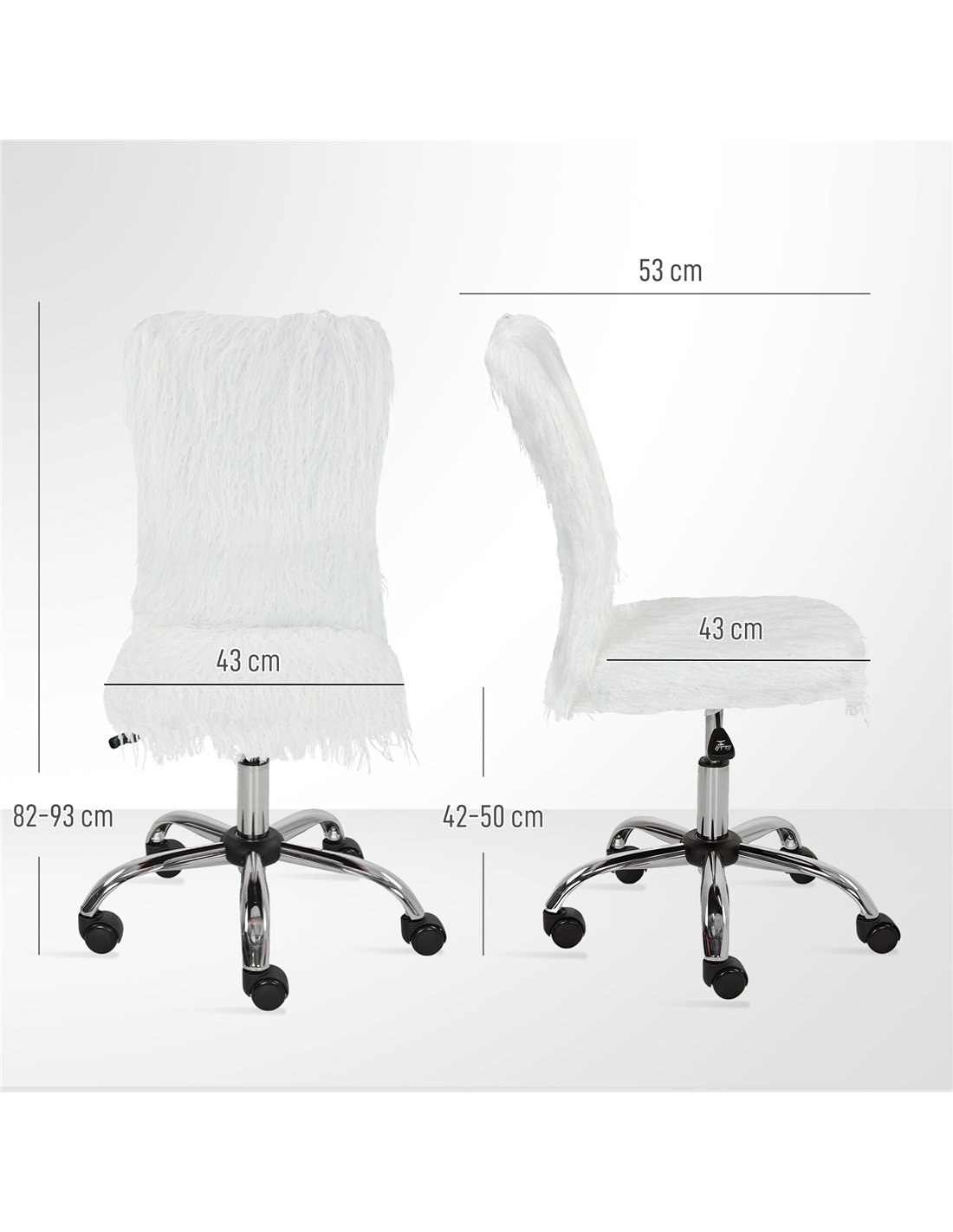 The HOMCOM plush swivel chair is an excellent addition to various living spaces across your home. Ideal for a home office setup, it offers ergonomic support during long working hours, enhancing productivity and comfort. Its sleek armless design and adjustable height make it a perfect fit for vanity tables in bedrooms, providing ease of movement and a stylish touch. Additionally, this chair complements living rooms as a versatile seating option for reading corners or casual workstations. Thanks to its smooth 360° swivel and PU wheels, it glides effortlessly on different floor types, making repositioning hassle-free. Whether used for study, computer work, or as a vanity seat, this chair blends functionality with modern aesthetics.