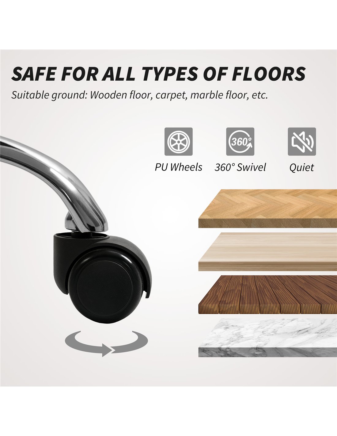 - 360° swivel seat and PU wheels allow easy movement on various flooring types
