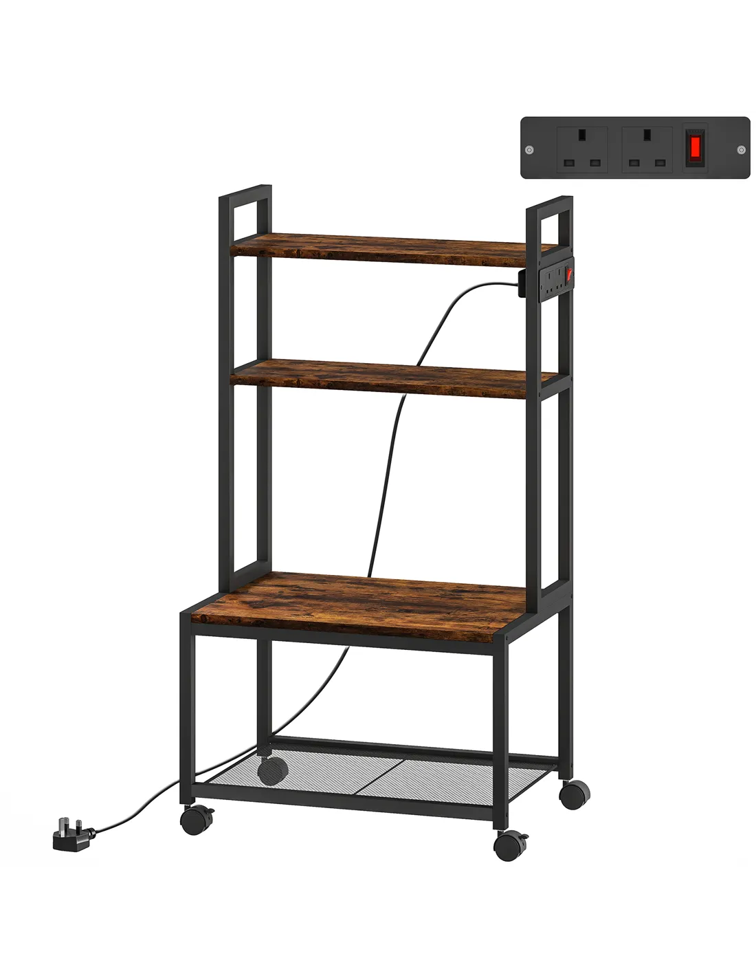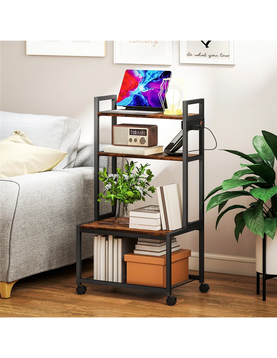 HOMCOM 4-Tier Printer Stand with Power Outlets and Wheels - Rustic Brown
