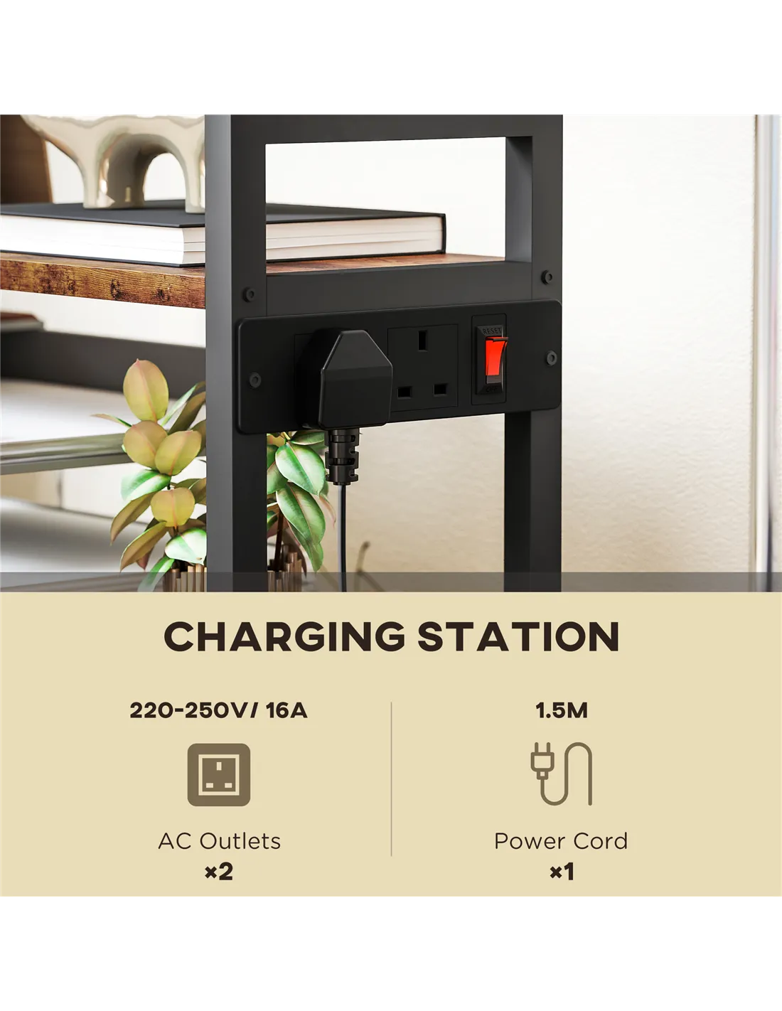 The total weight capacity is 21 kg, with the countertop supporting up to 10 kg, the bottom shelf 5 kg, and each of the other shelves 3 kg. - Are the power outlets compatible with UK plugs?