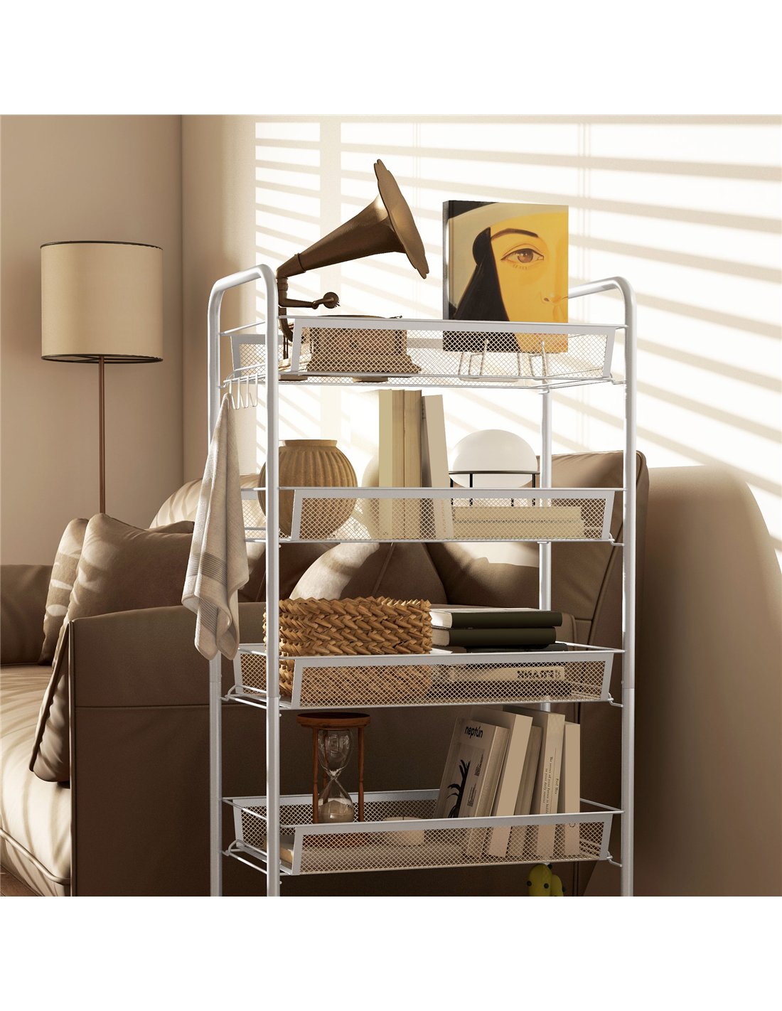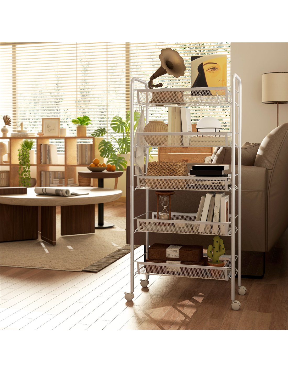 The HOMCOM five-tier mesh trolley is a versatile storage solution ideal for various rooms in your home. Use it in the kitchen to organise fresh produce, utensils, or pantry items, benefiting from the breathable wire baskets that prevent moisture build-up. In the office, it serves as a practical organiser for stationery, documents, and supplies, while in the bedroom it can neatly hold accessories or craft materials. Thanks to its sturdy steel frame and smooth-rolling wheels with locking brakes, it is easy to move between spaces such as the garage or utility room, providing flexible storage wherever needed. Its compact dimensions make it suitable for smaller spaces without compromising on capacity.