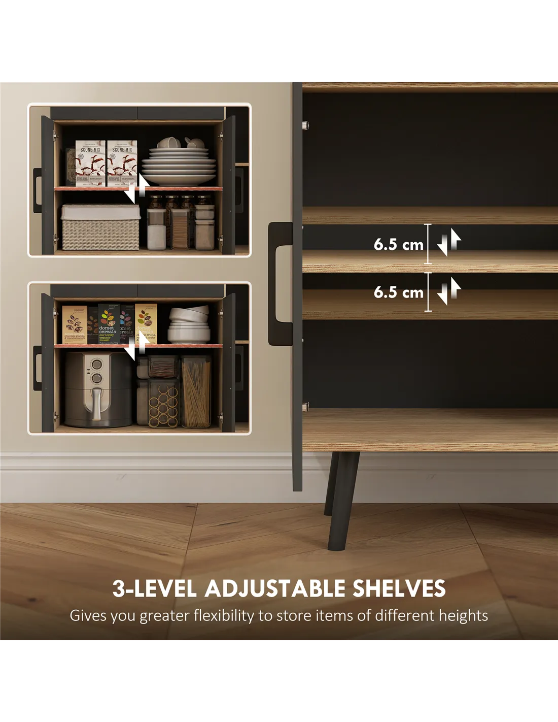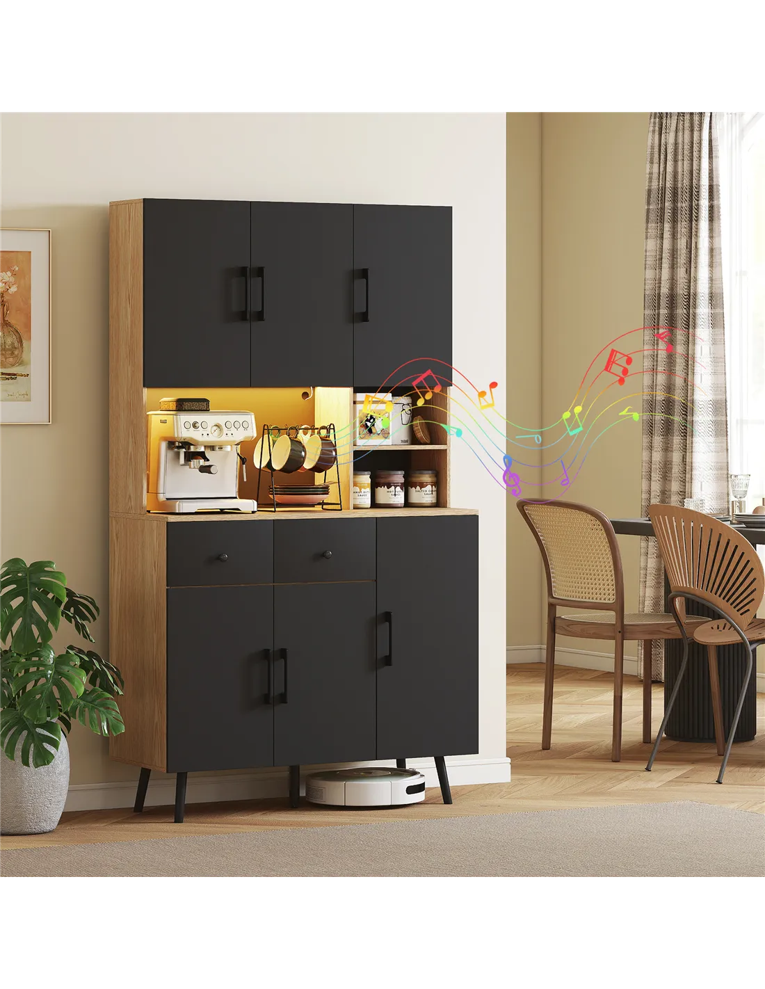 The HOMCOM 176 cm kitchen cupboard with LED lighting is a versatile addition to any modern British home. Perfect for organising cookware, utensils, and pantry essentials, it transforms cluttered kitchens into neat, stylish spaces. The oak and black finish complements a variety of interior styles, from contemporary to rustic. Use the adjustable shelves to store bulky appliances or delicate glassware, while the USB-powered RGB LED strip creates an inviting atmosphere for evening gatherings or casual family meals. Its spacious countertop offers an ideal surface for meal preparation or displaying decorative items, making it a practical yet elegant kitchen solution.