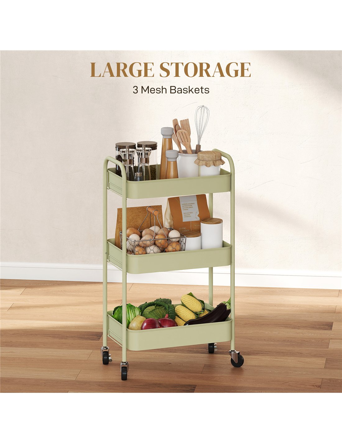 The HOMCOM three-tier steel trolley in green offers versatile storage solutions for various rooms in your home. Ideal as a kitchen organiser, it neatly holds utensils, spices, or fresh produce. In the bathroom, it serves as a practical storage unit for toiletries and towels. Use it as a stylish drinks trolley during gatherings or as a compact laundry cart to keep essentials within easy reach. Its sturdy steel frame and mesh baskets ensure durability and ventilation, making it perfect for craft supplies, office materials, or even as a makeup station. Thanks to its smooth-rolling wheels and secure brakes, relocating the trolley around your living space is effortless.
