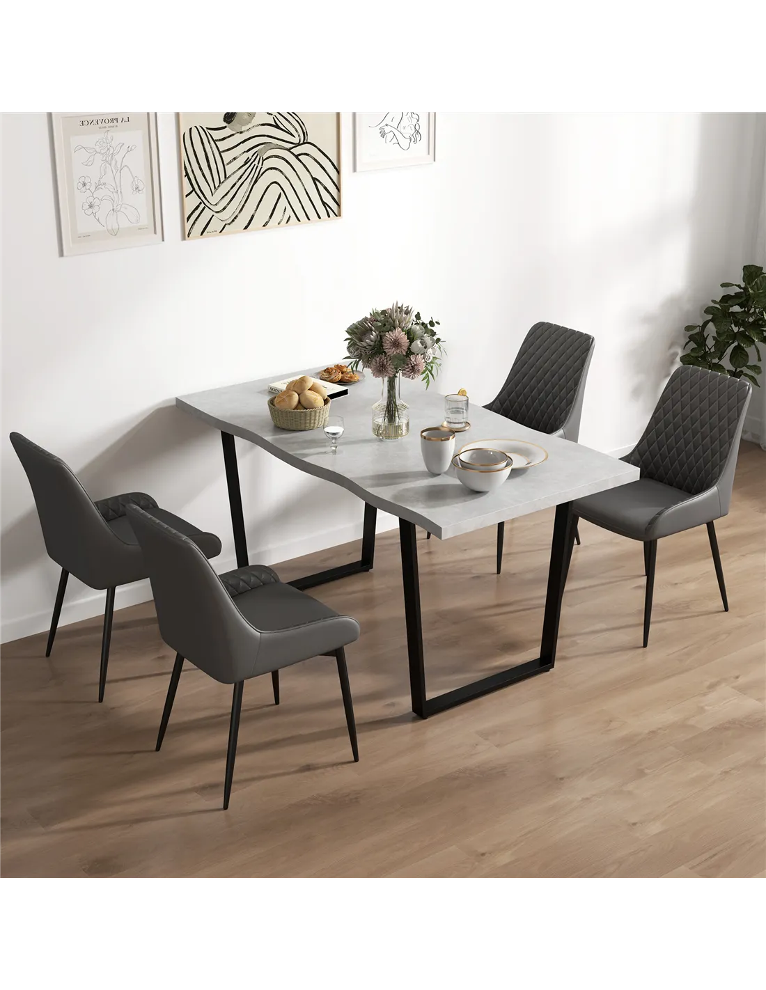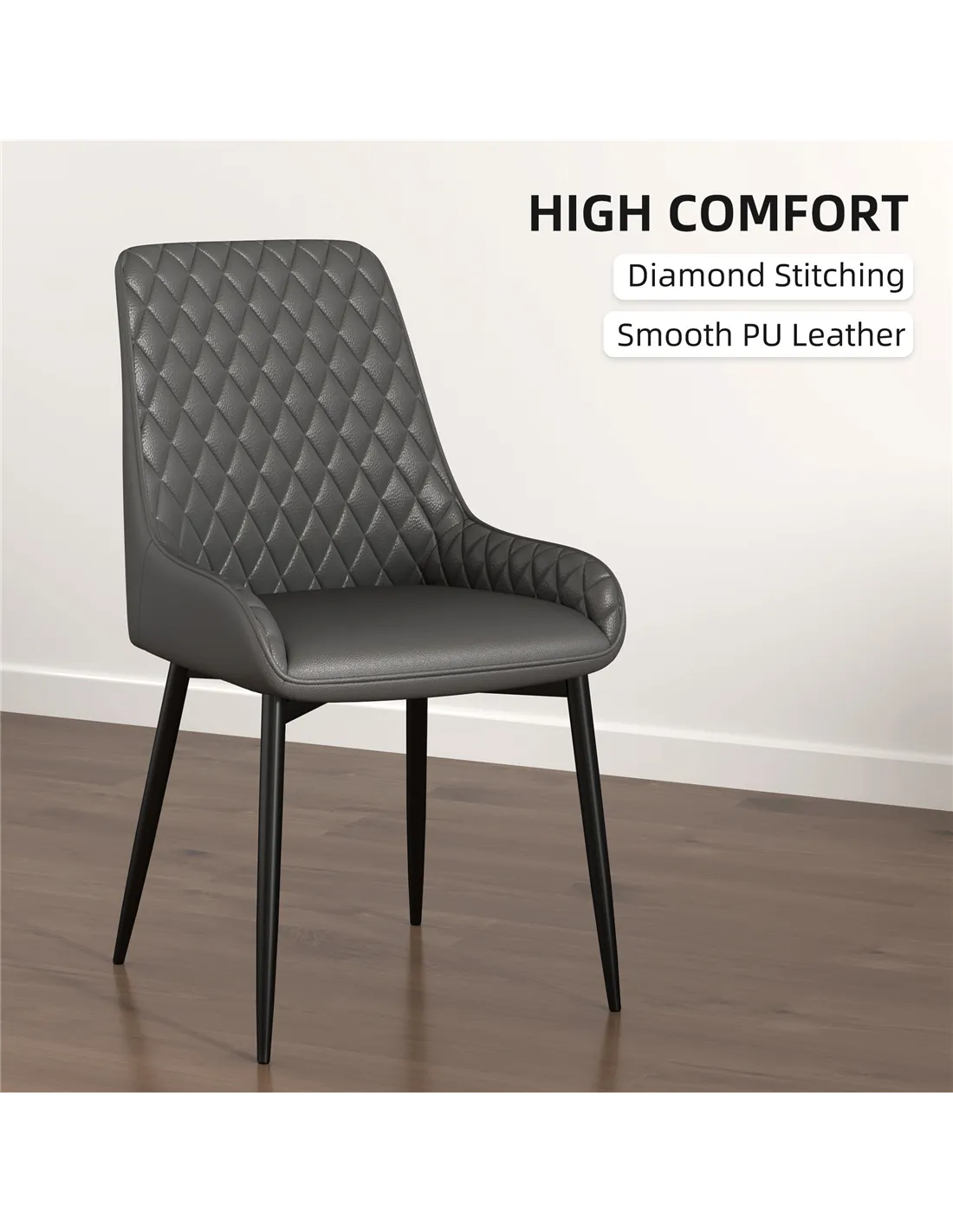 - Perfect for modern dining rooms, these chairs add a touch of elegance with their quilted PU leather upholstery and sleek metal frames.