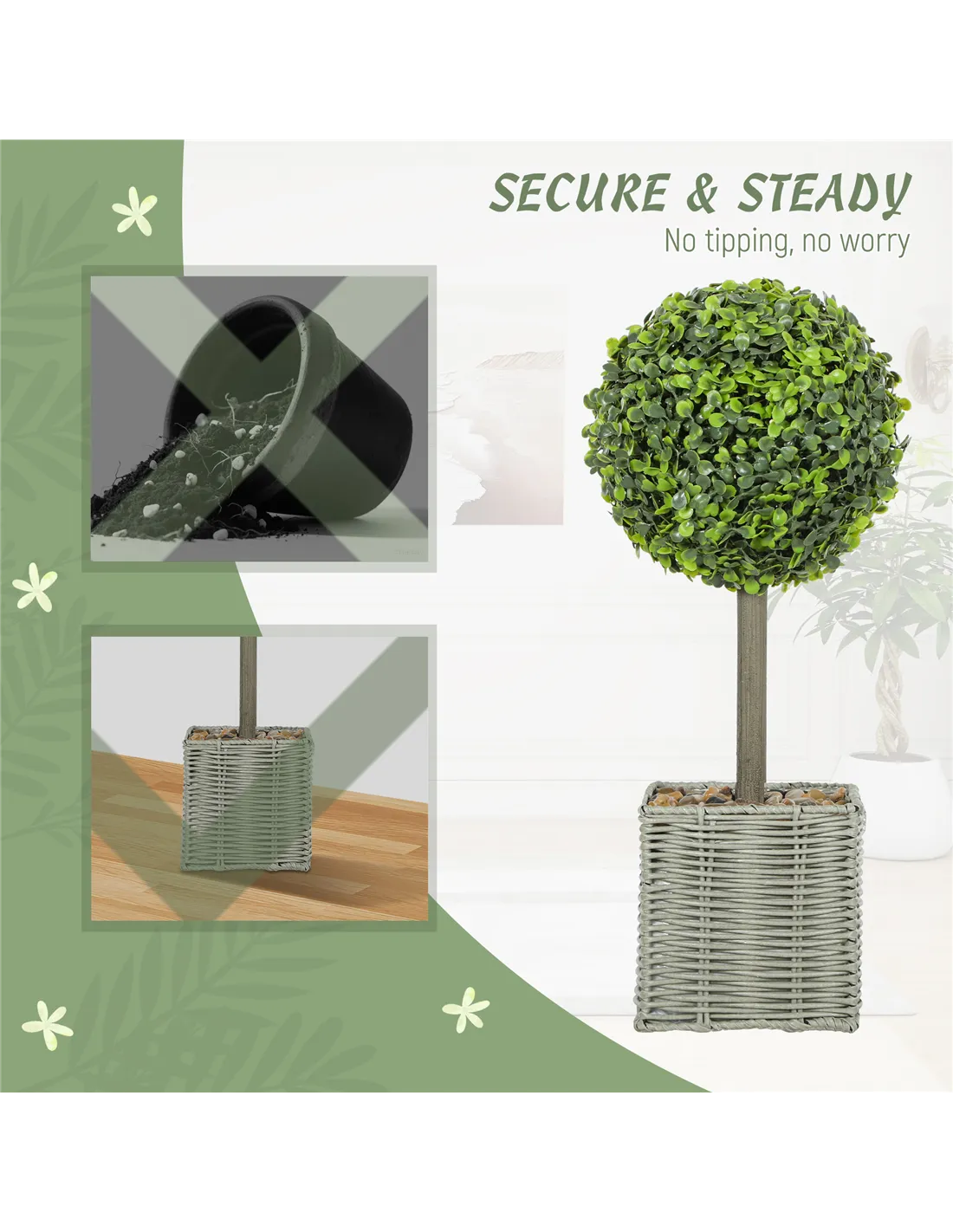 Based on customer reviews, the Homcom artificial topiary set is praised for its realistic appearance and sturdy design. Buyers appreciate the no-fuss upkeep, highlighting how the weighted cement base keeps the plants stable even on uneven surfaces. Many note the convenience of receiving the plants fully assembled, ready to display immediately. Users also commend the quality of the woven plastic pots and decorative pebbles, which add an authentic touch to their home or office decor. Homcom — a recognised brand in indoor furnishings across the UK — consistently delivers products that combine style with practicality.