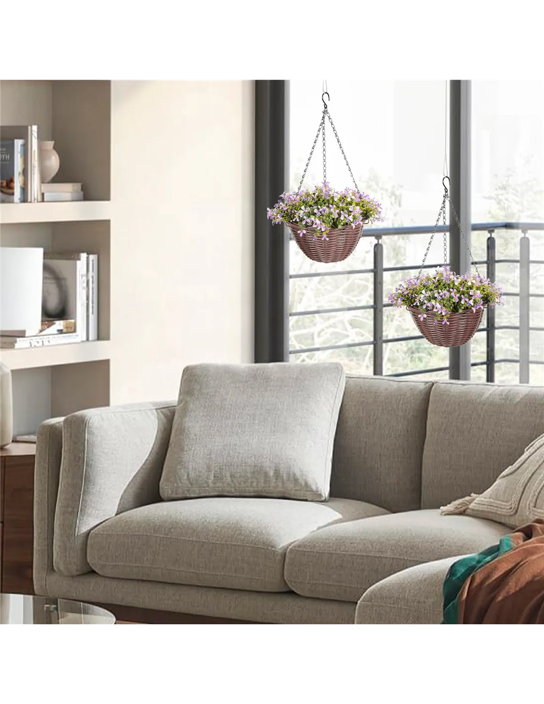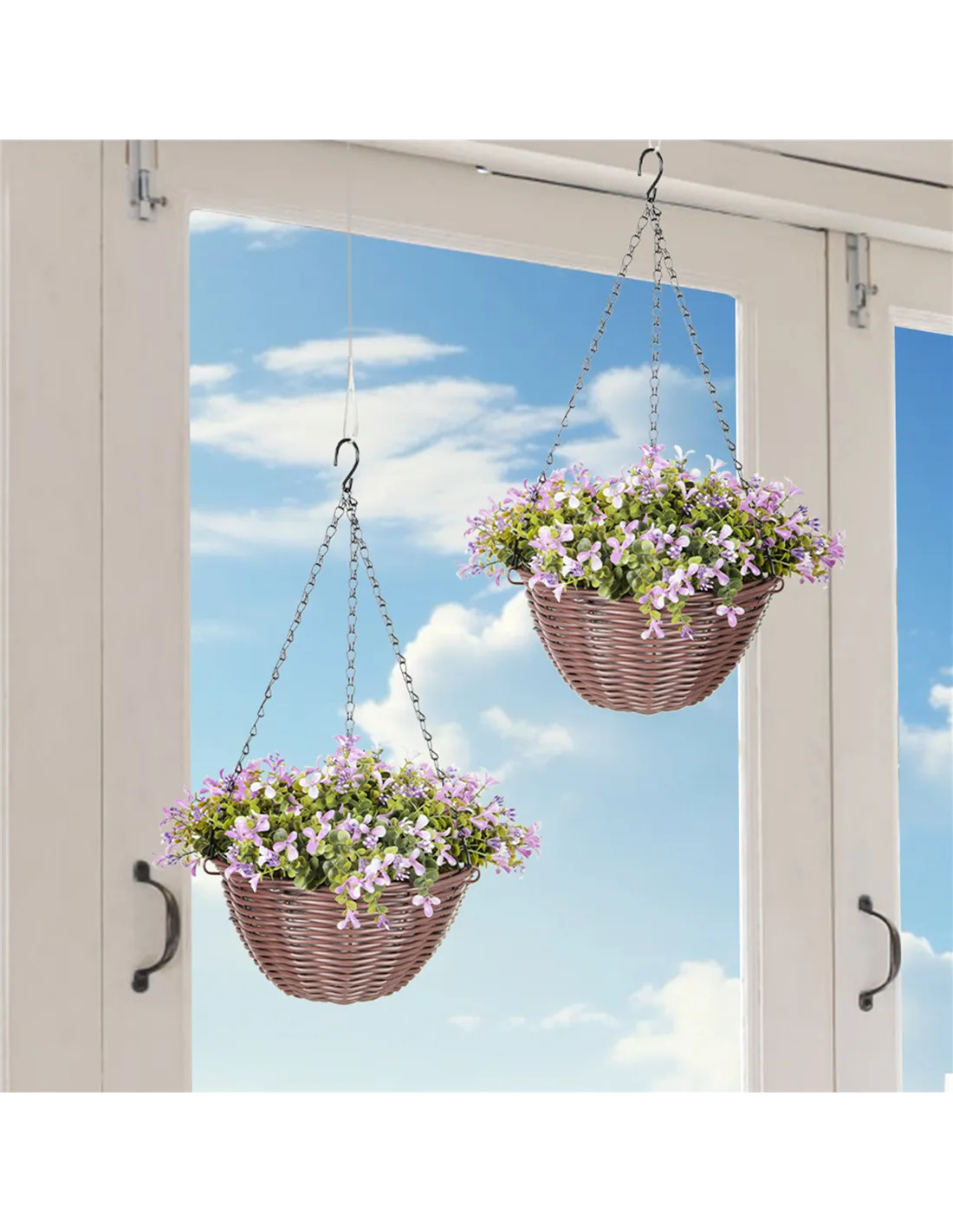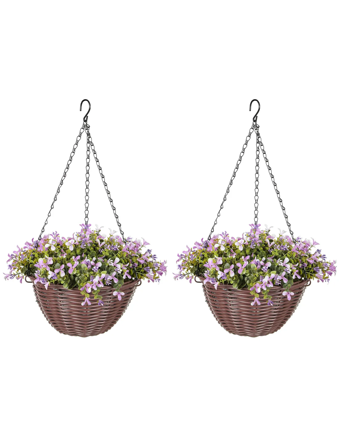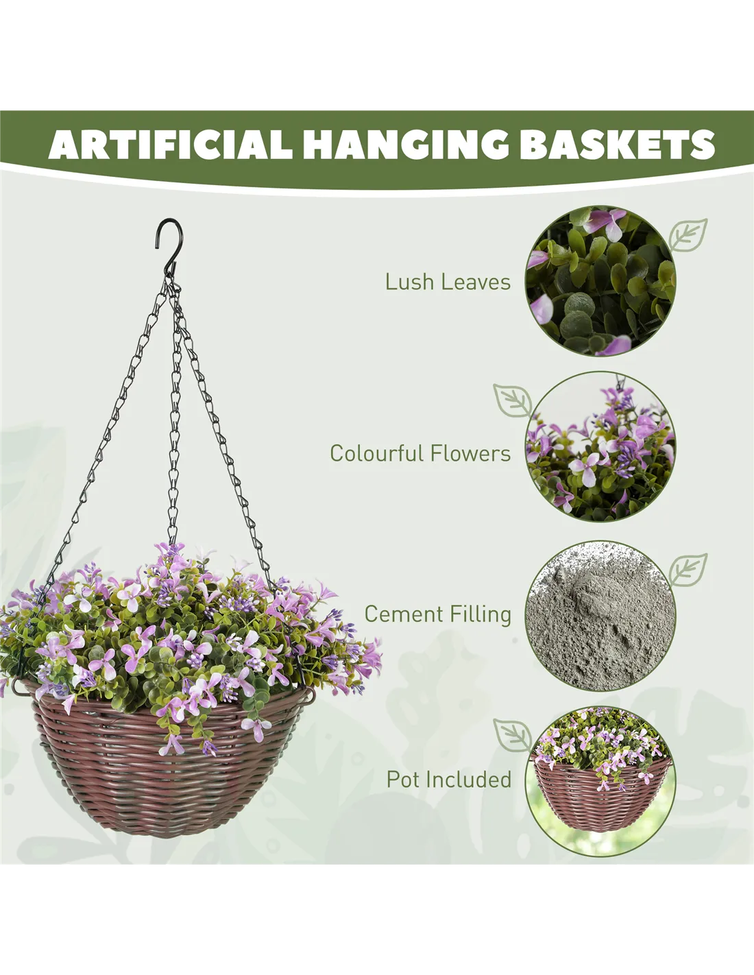 HOMCOM Artificial Flowers in Basket Set of 2, Artificial Hanging Baskets with 75 Leaves and 15 Flowers in Pot, Decorative Plant for Home Office Decor, Purple