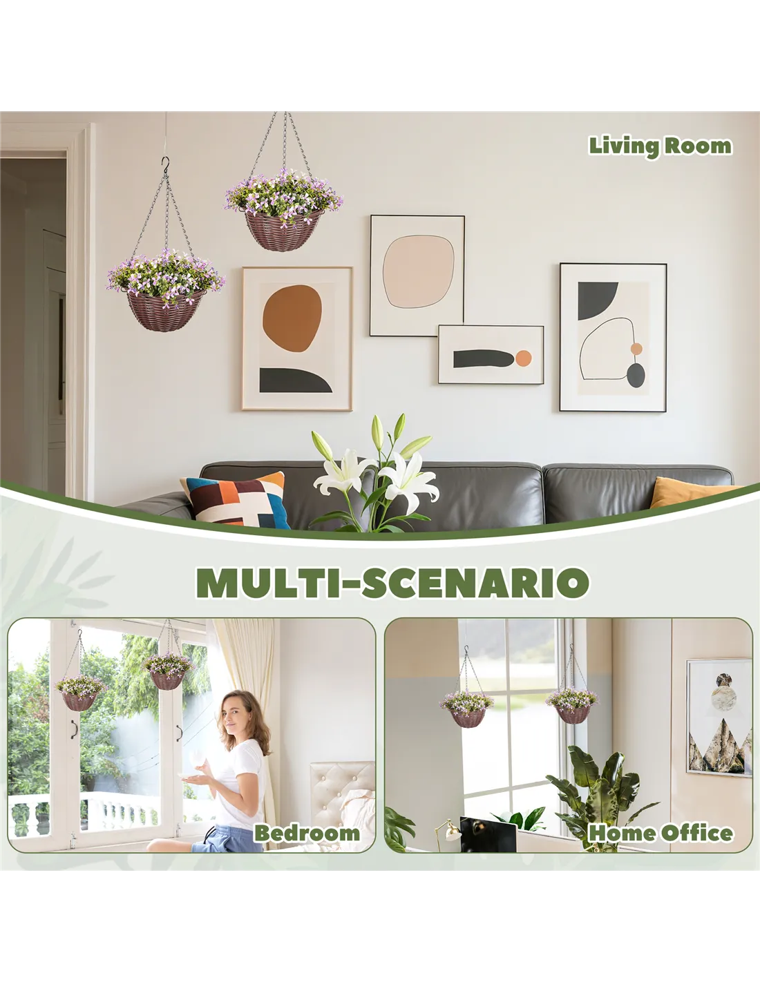 The baskets feature durable PE leaves and flowers, with cement soil in a metal pot for stability and longevity. - Can these hanging baskets be used outdoors?