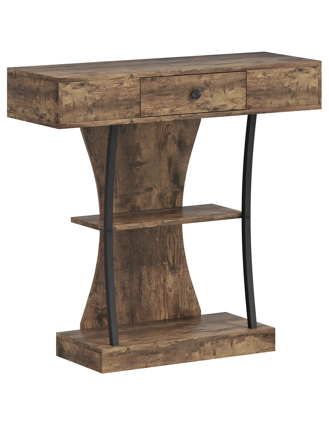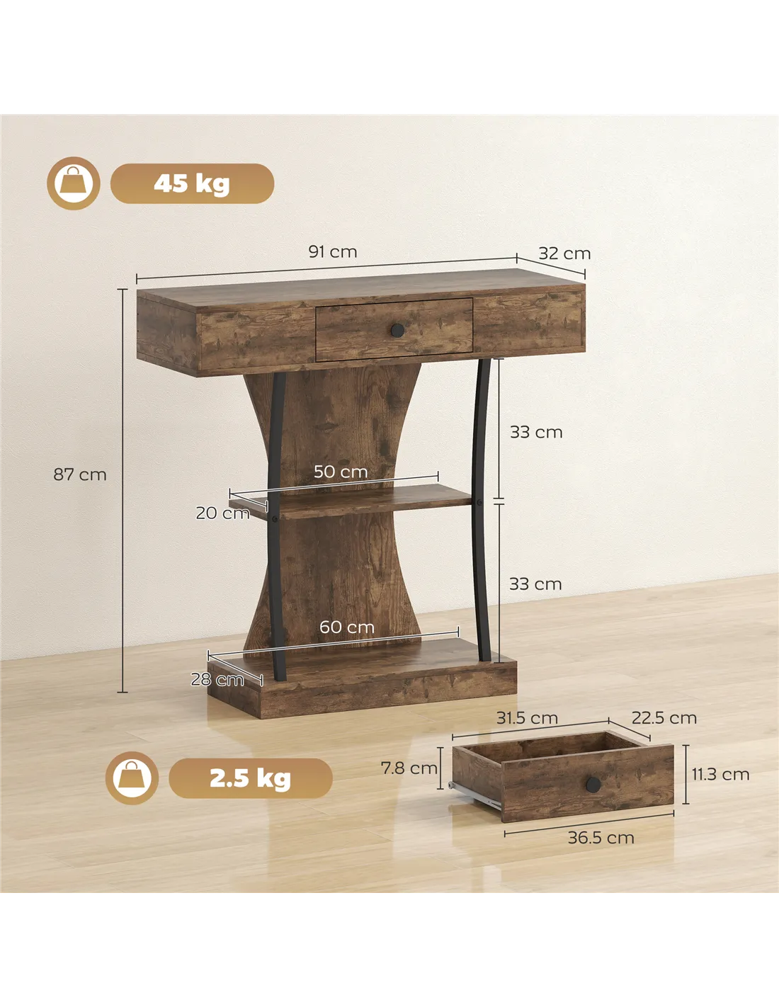 HOMCOM 3-tier console table in rustic brown and black. Measures 91 x 32 x 87 cm. Steel frame with particle board shelves gives sturdy support and a vintage industrial look. Tabletop, two open shelves and a drawer provide organised storage for daily items. Anti-tip kits add safety for family living spaces. Suitable for hallway, living room, bedroom or behind the sofa. Assembly required. Delivery times are listed under the price on the product page.