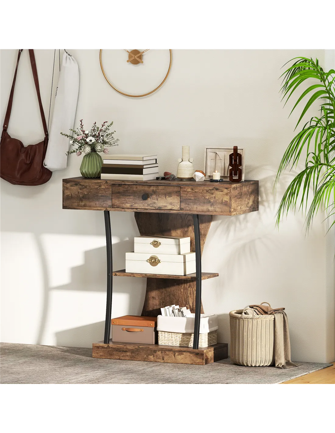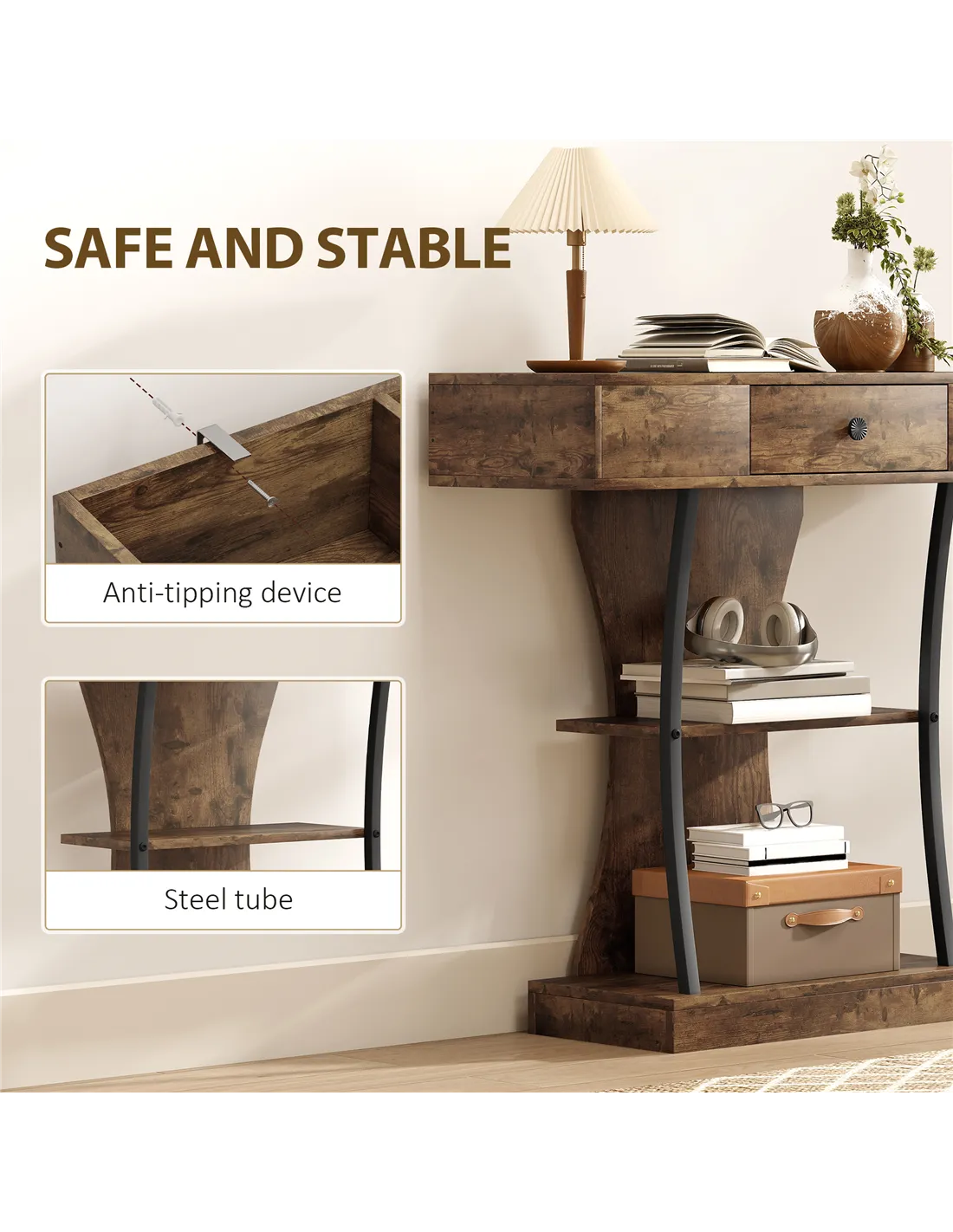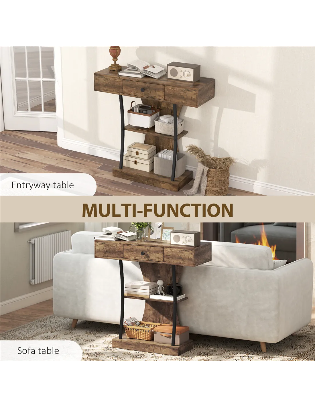 HOMCOM Console Table, 3-Tier Industrial Hallway Table with Drawer, Storage Shelves, 91 x 32 x 87 cm, Rustic Brown