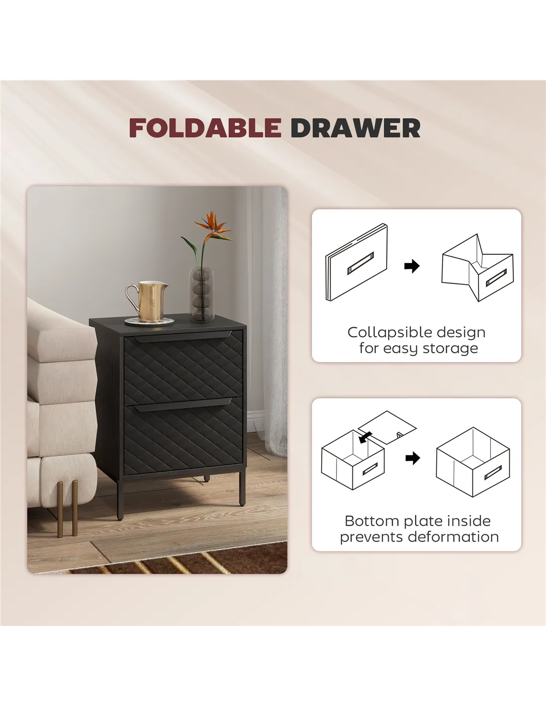 - Foldable drawers collapse flat for compact storage when not in use
