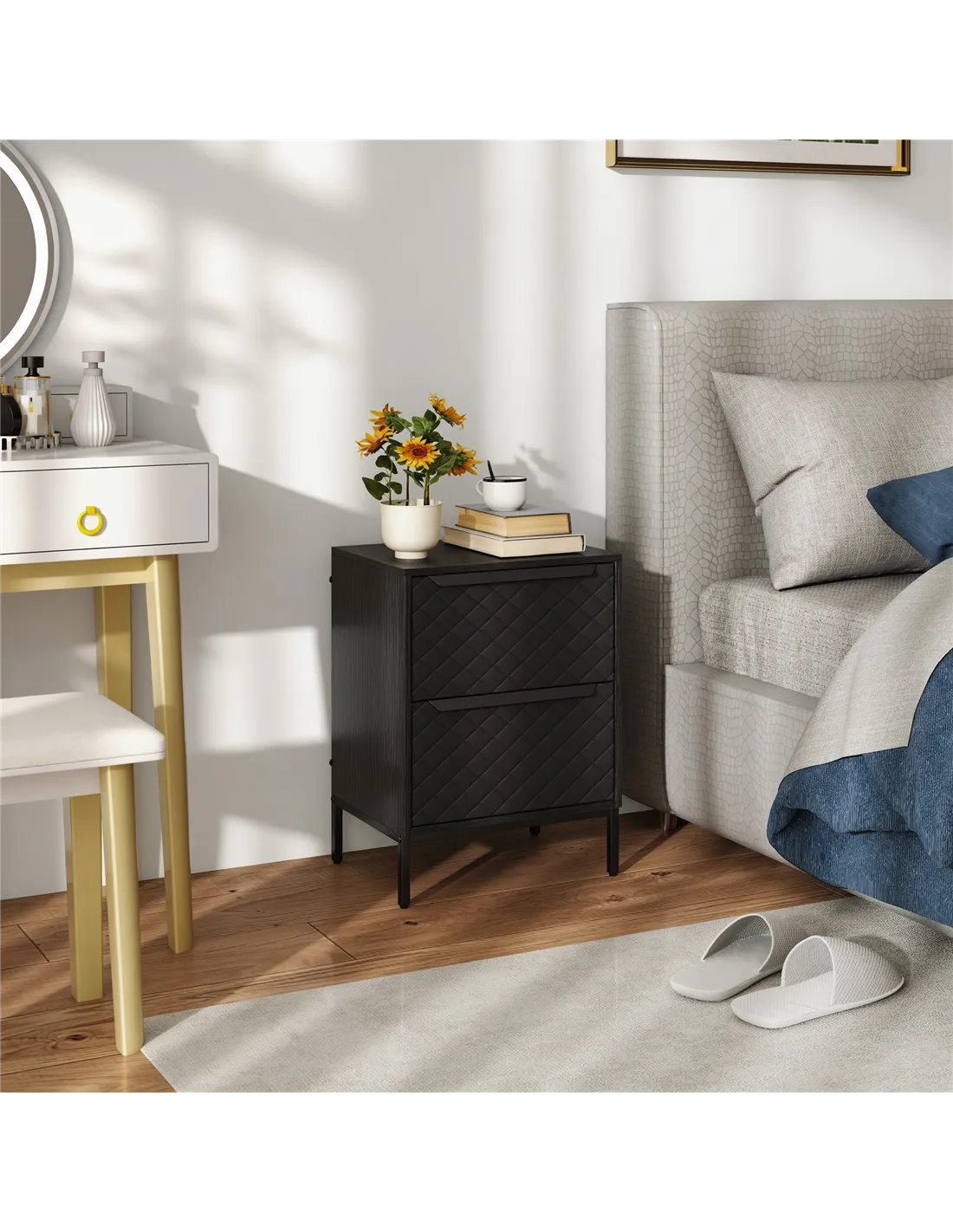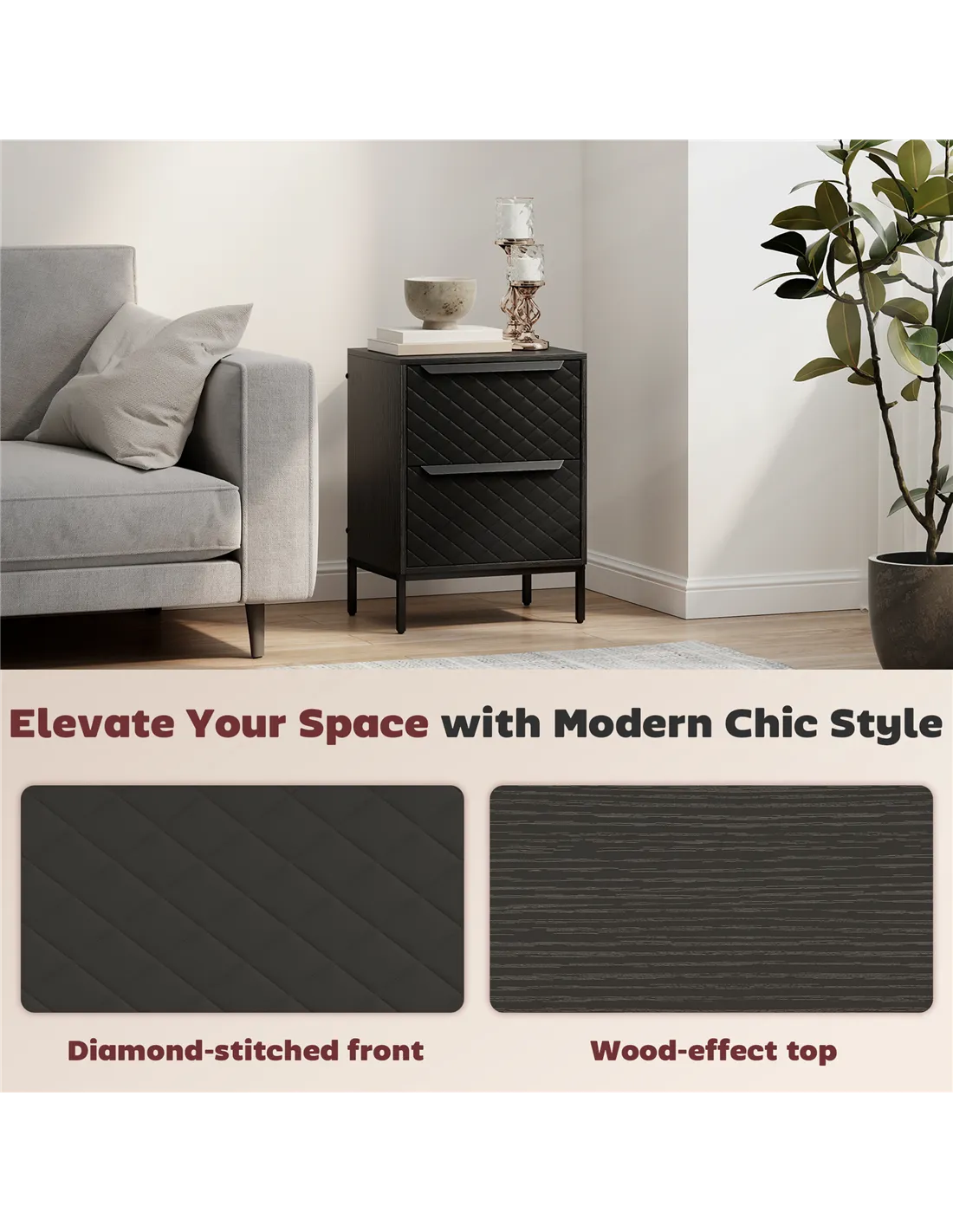 - Diamond-stitched faux leather fronts with wood-effect frame for stylish home decor