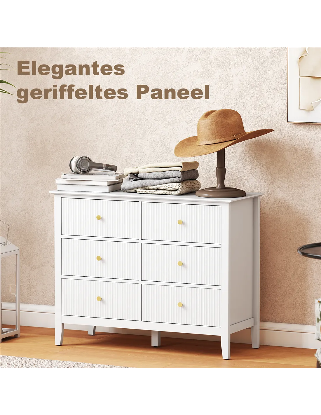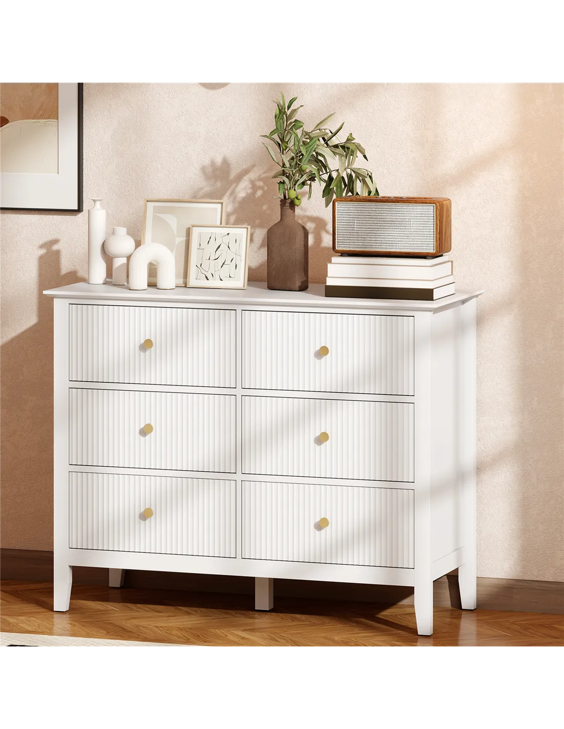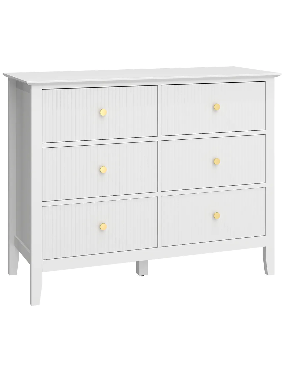 The HOMCOM Fluted Dresser provides essential home organisation. This white 6 drawer chest stores clothes and essentials. It fits perfectly in a bedroom, living room, or hallway. Distinctive fluted drawer fronts and gold-tone handles deliver modern elegance. Six large drawers manage your belongings. A wide top surface offers additional display space. The dresser stands on a reinforced frame. Adjustable feet ensure stability on various floor types. Anti-tipping kits enhance home safety. This furniture piece offers practical storage and a stylish design solution.Features: