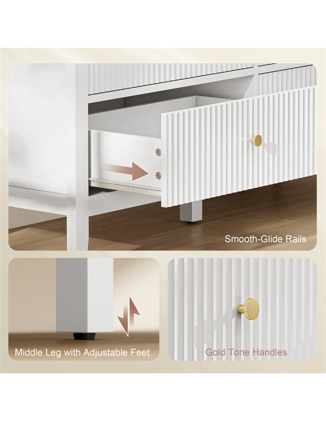 - Fluted drawer fronts and gold handles bring refined modern elegance to any room