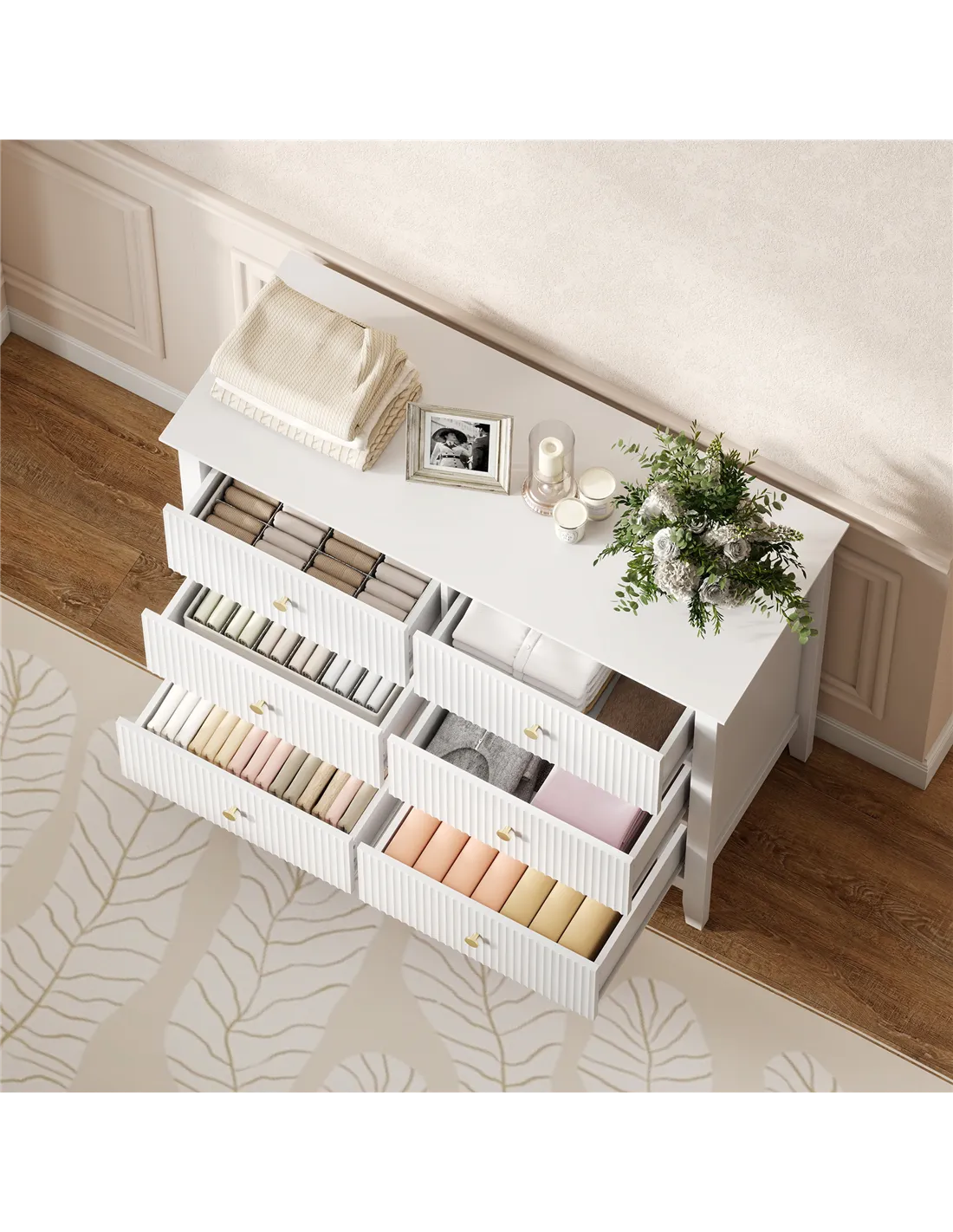 - Six drawers and wide top keep clothes and essentials neatly organised