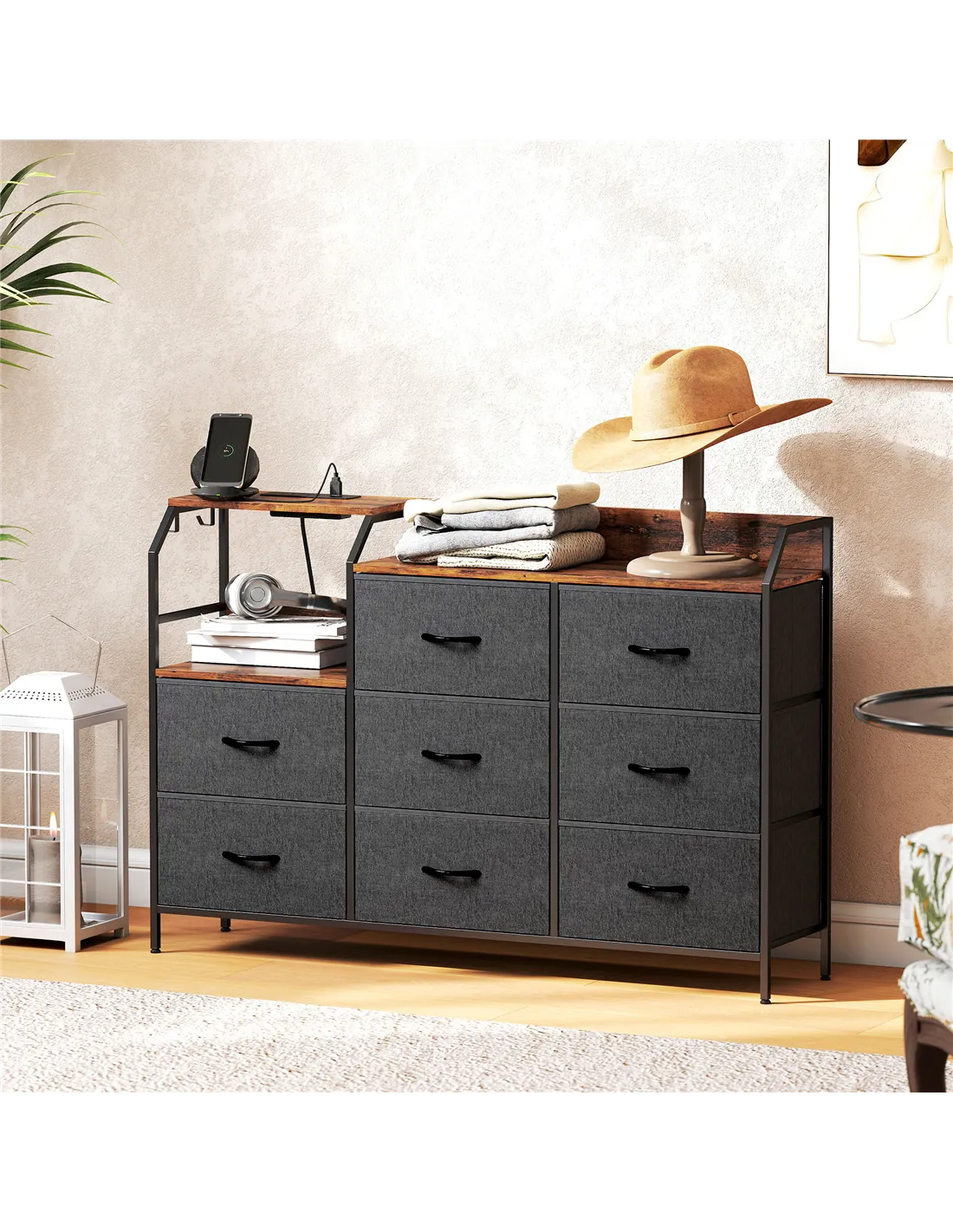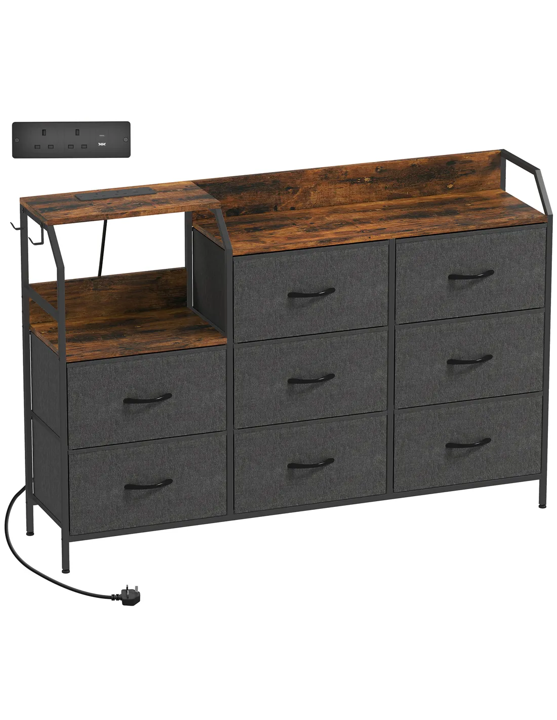 Organise your living space with the HOMCOM Chest of Eight Drawers. This versatile storage unit features a built-in charging station, simplifying device power management. Power your phone, tablet, and lamp directly from the unit. Eight fabric drawers offer ample room for clothes and household items. The tiered top provides display space. Two side hooks store accessories. A strong steel frame ensures stability. The rustic brown and black finish adds industrial charm to your home. It measures 130.5cm wide, 30cm deep, and 88cm high.