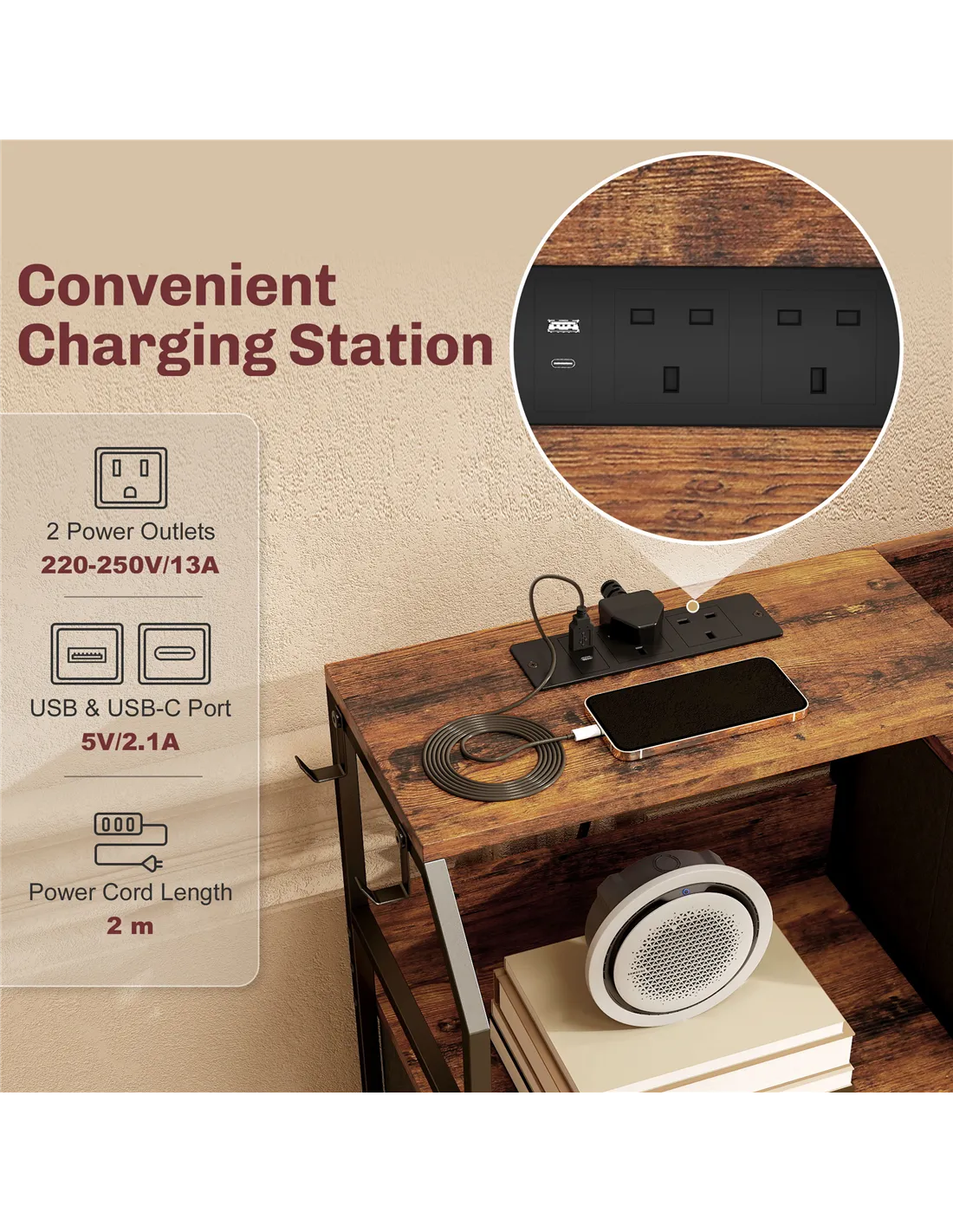 - Built-in power station with two plug sockets, a USB and a USB-C port. Keep devices powered in one place