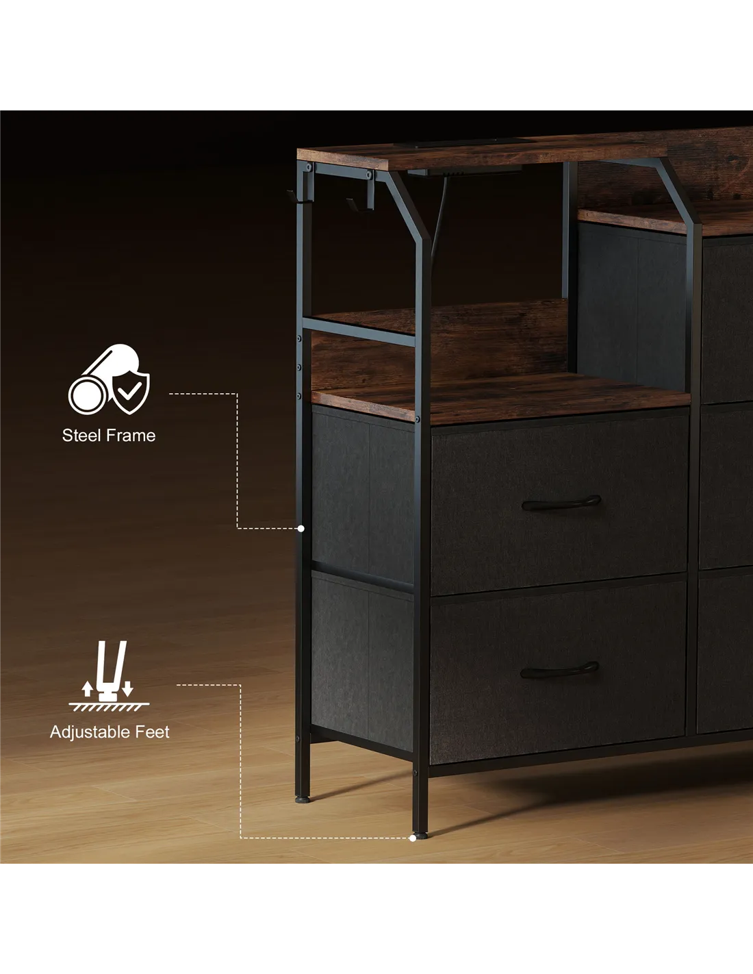 - Adjustable feet keep dresser balanced. Protects floors from light scratches and marks