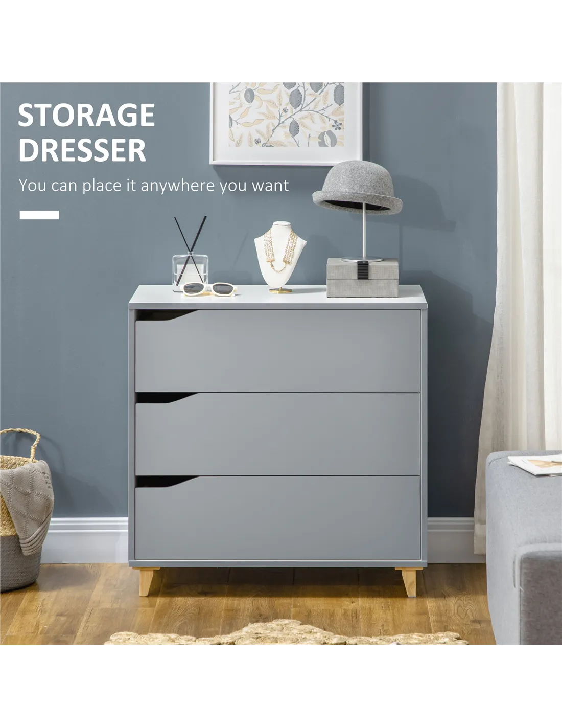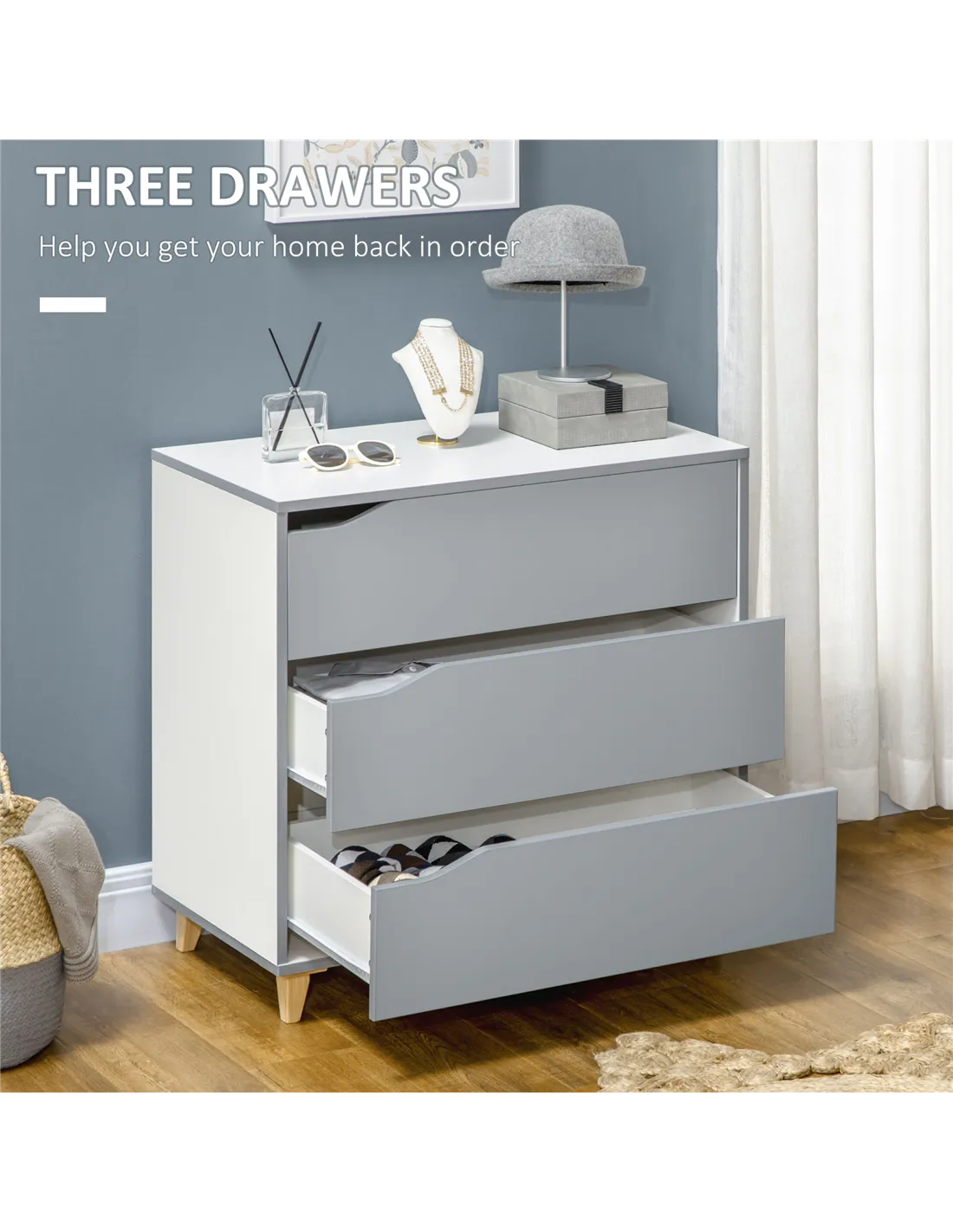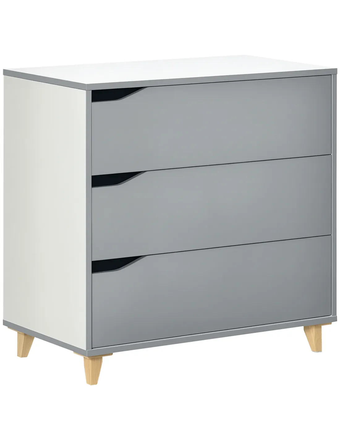 HOMCOM Drawer Chest, 3-Drawer Storage Cabinet Unit with Pine Wood Legs for Bedroom, Living Room, 75cmx42cmx75cm, Grey