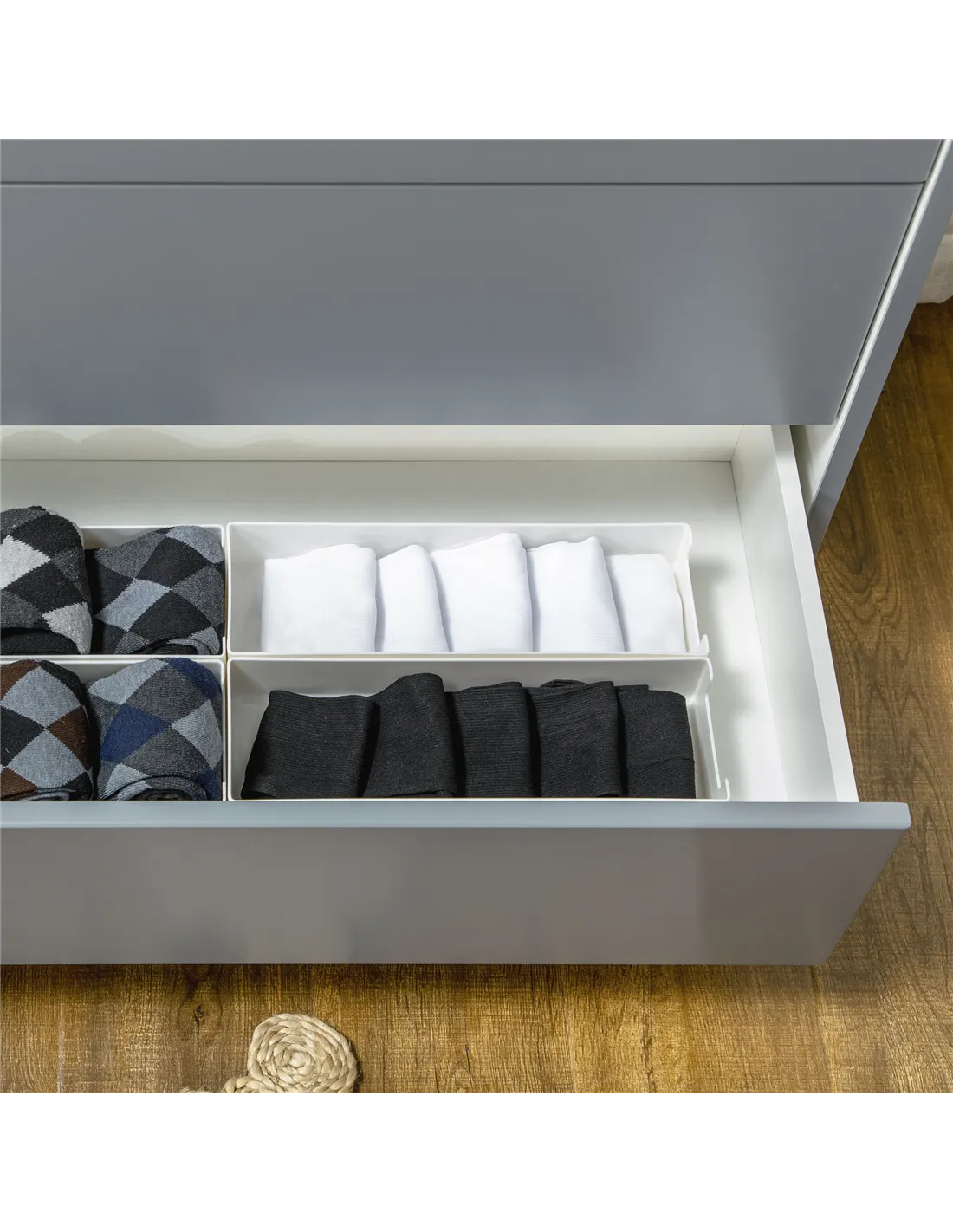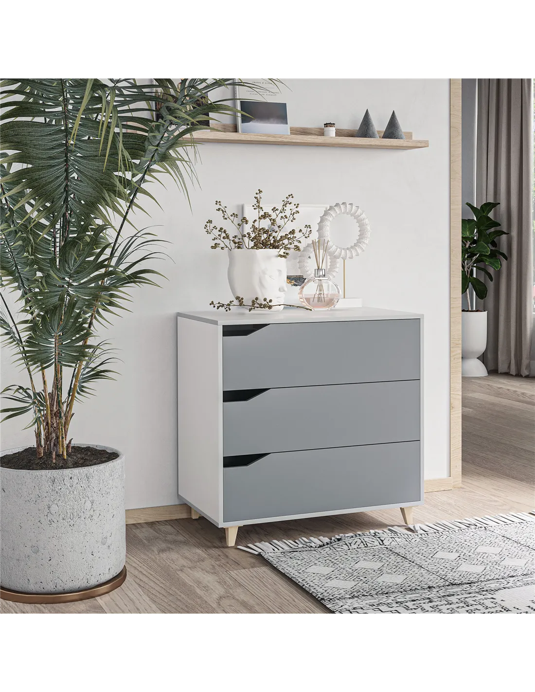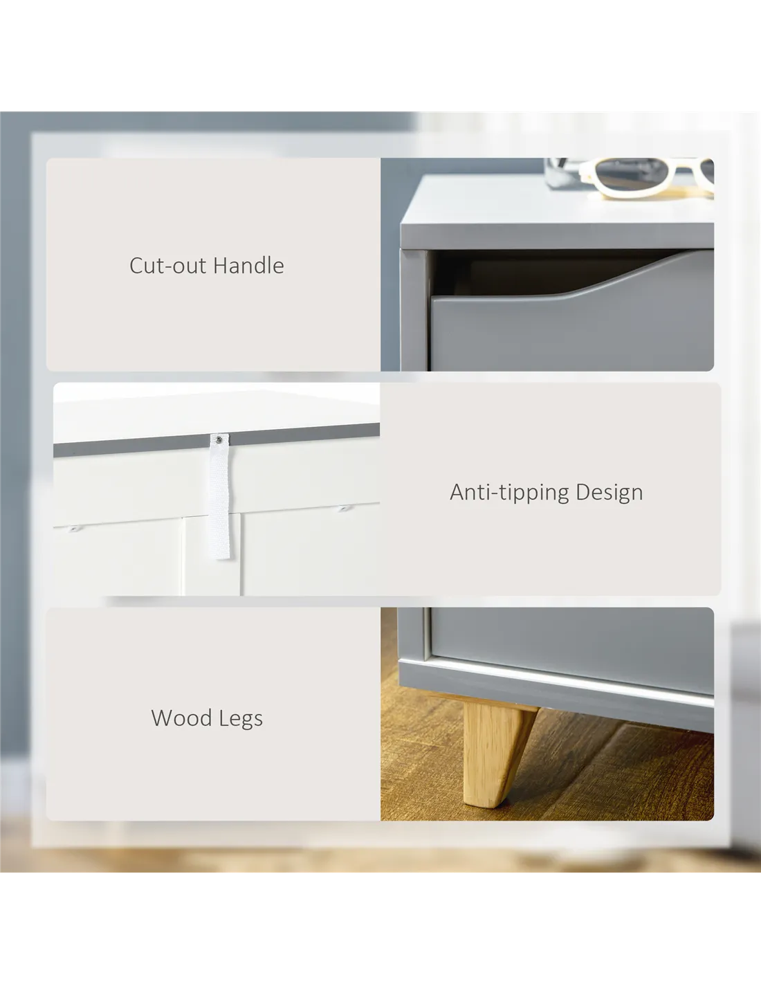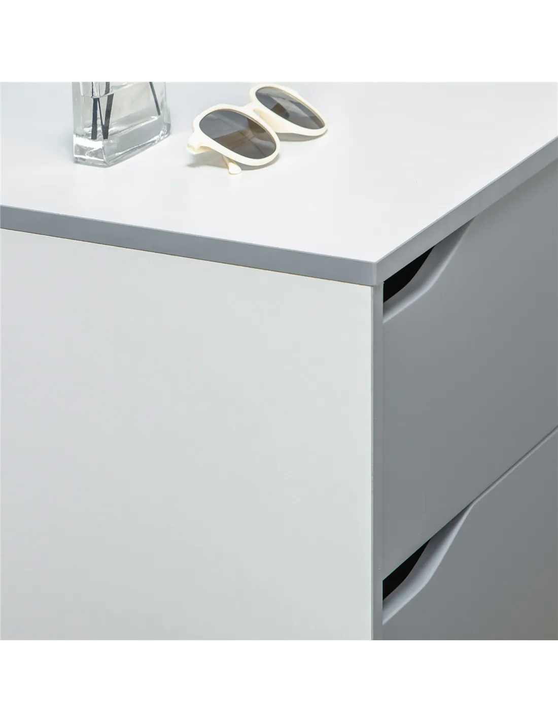 - Cut-out handles on each drawer to open and close easily