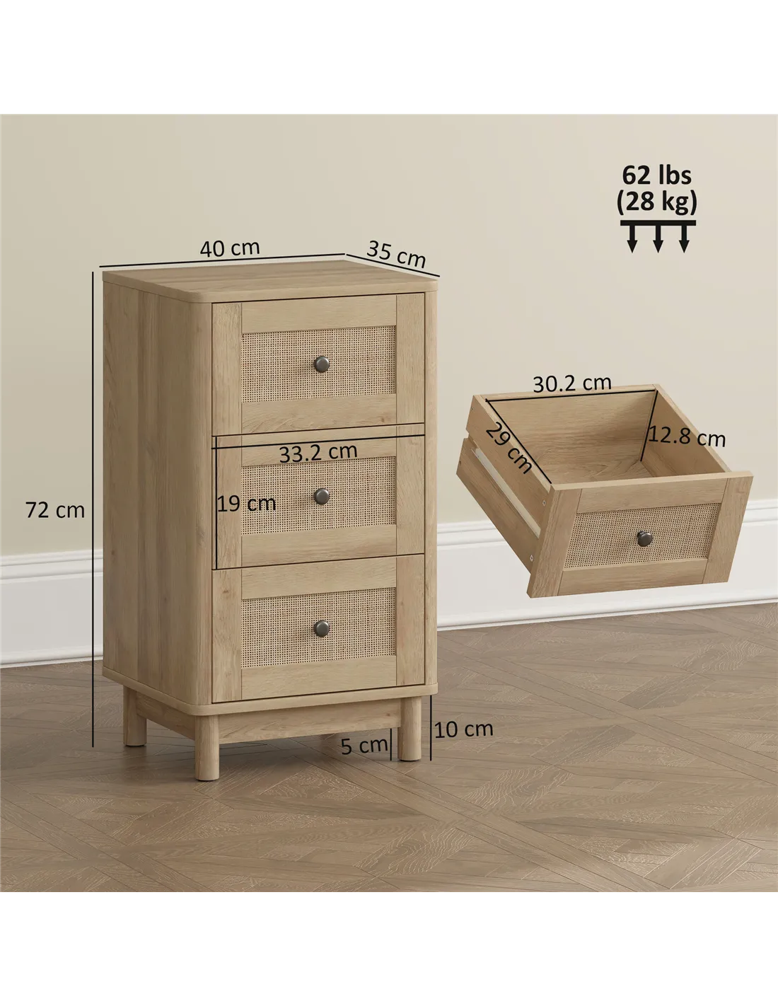 - Maximum Load: 6 kg (each drawer), 10 kg (top), 28 kg (total)