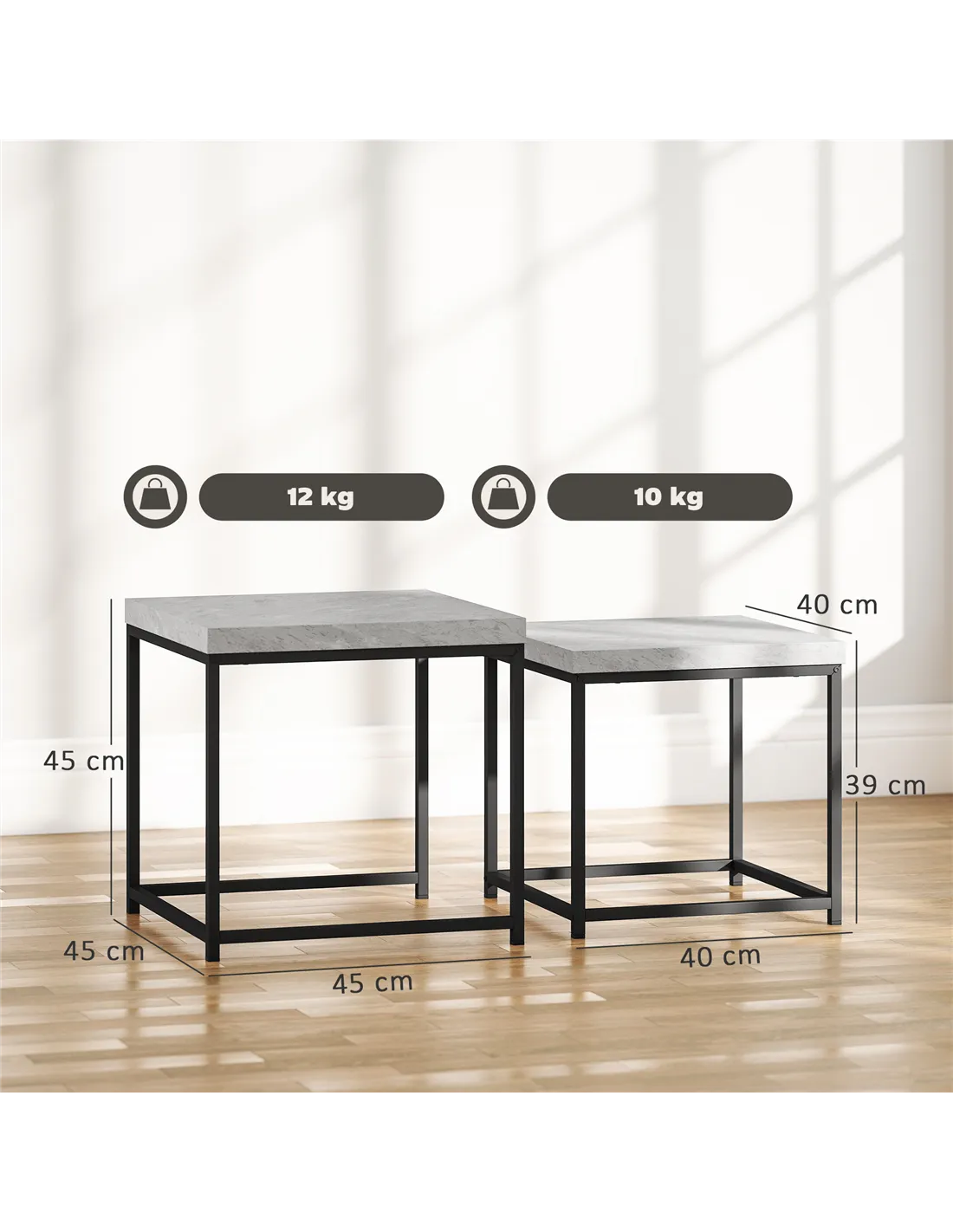 - A: The large table measures 45L x 45W x 45Hcm. The small table measures 40L x 40W x 39Hcm.
