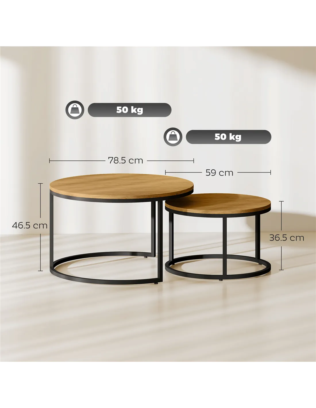 - Round table tops for lots of holding room, made from MDF in a beautiful wood-effect
