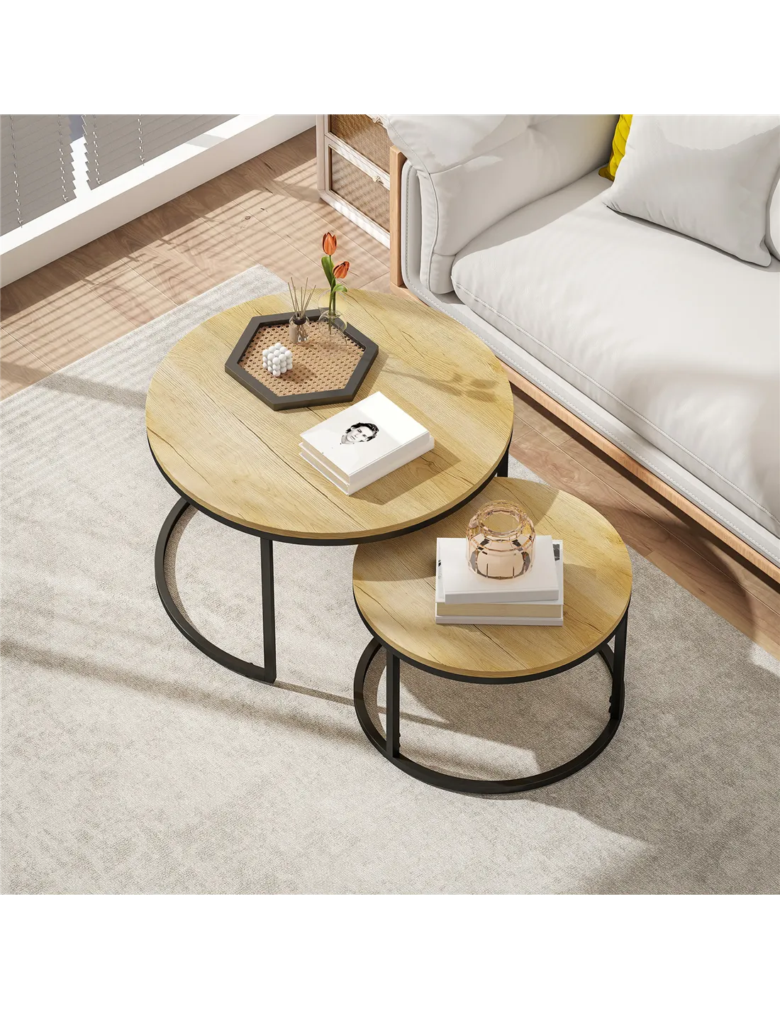 The HOMCOM Set of Two Wood-Effect Stacking Tables in Natural provides adaptable surface solutions for your living space. This versatile set includes a small and a large table. You use them together for a layered look or separate them for additional display or serving areas. The tables slide together efficiently for compact storage. Steel frames ensure a stable, robust structure. Each round table top features a durable wood-effect finish on MDF, offering lasting style and beauty. This functional design suits various room layouts and meets your household needs.