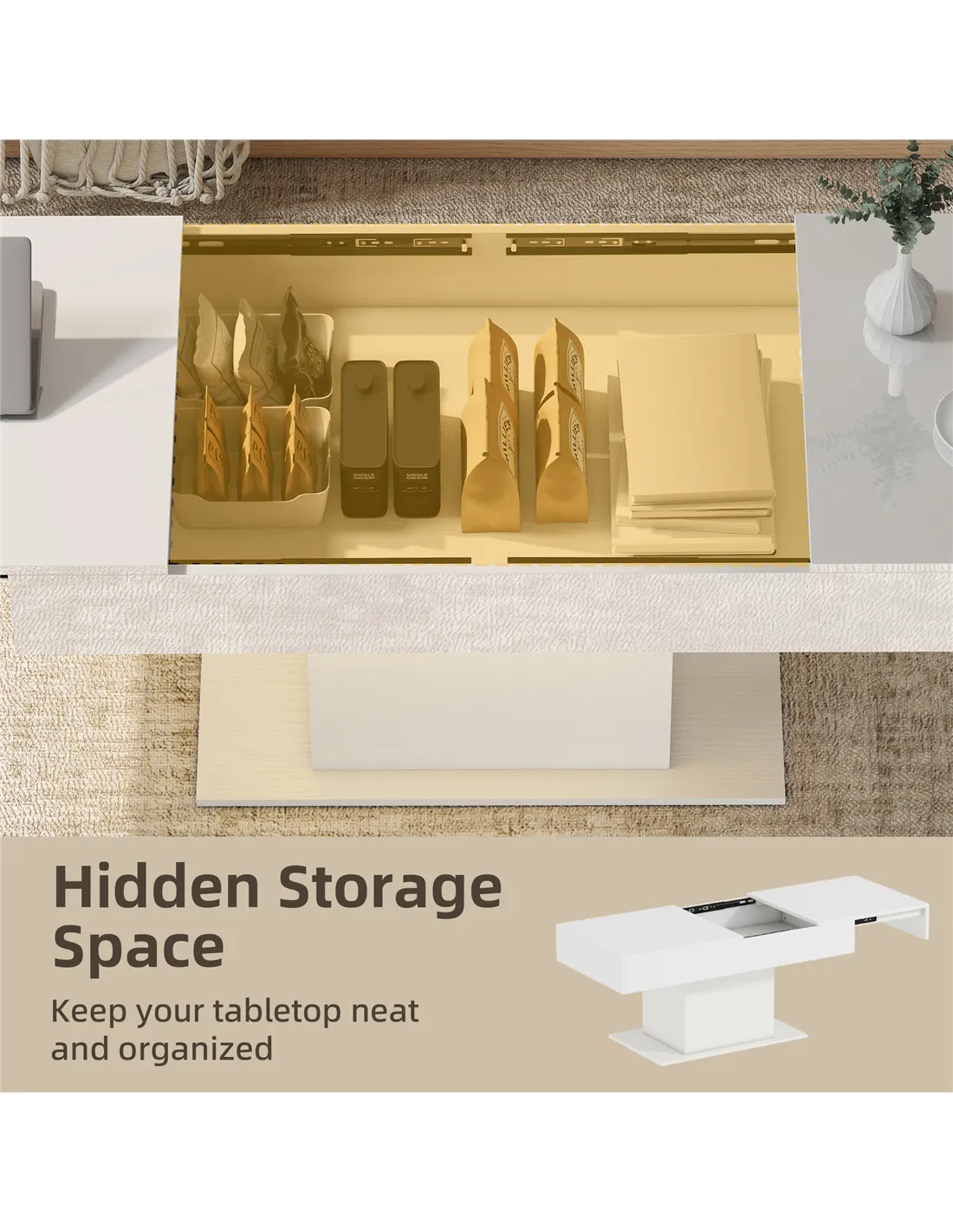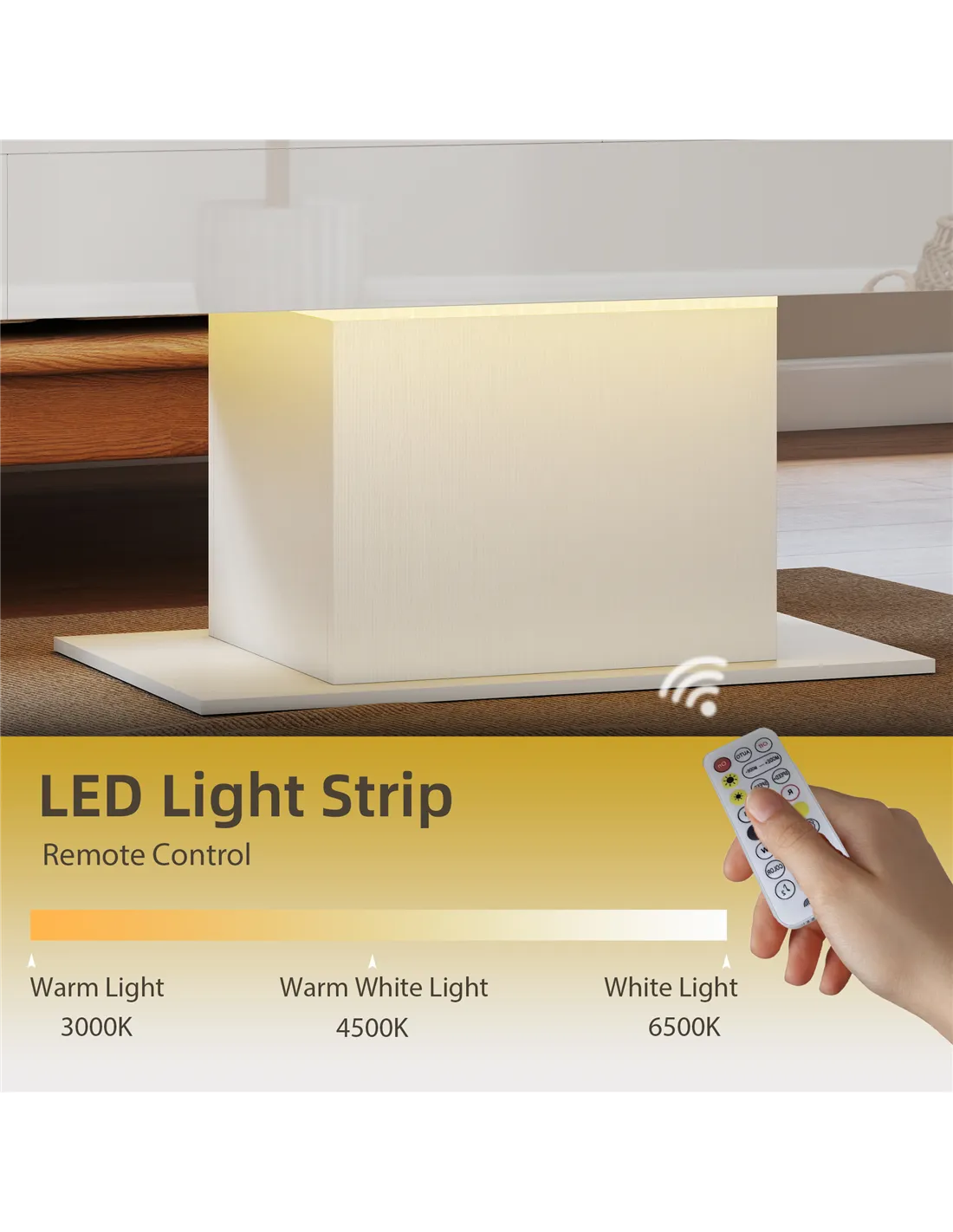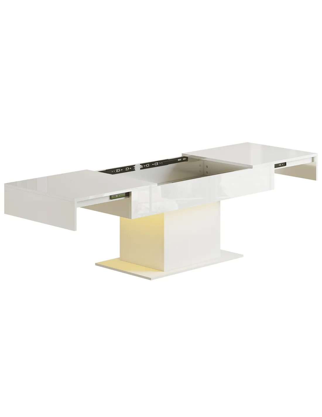 A: This coffee table extends from 108 cm to 178.5 cm, includes a large hidden storage compartment, and features remote-controlled three-colour LED lighting. It comes in a high-gloss white finish with a wood-grain base. - Q: What are the dimensions of the coffee table?