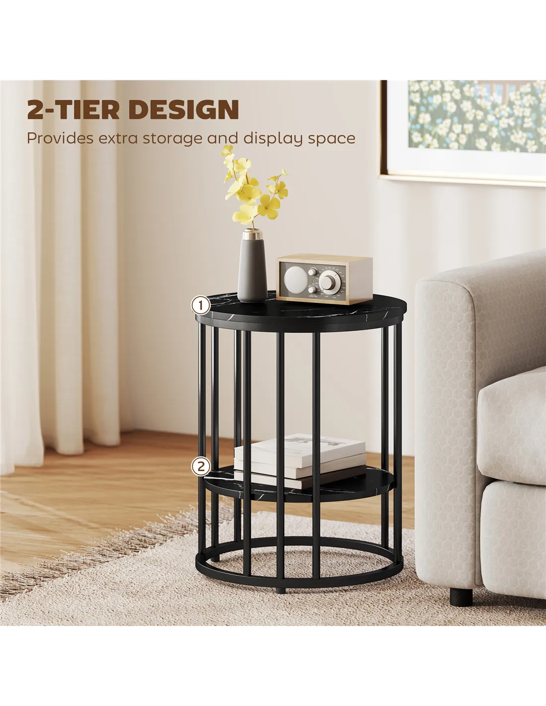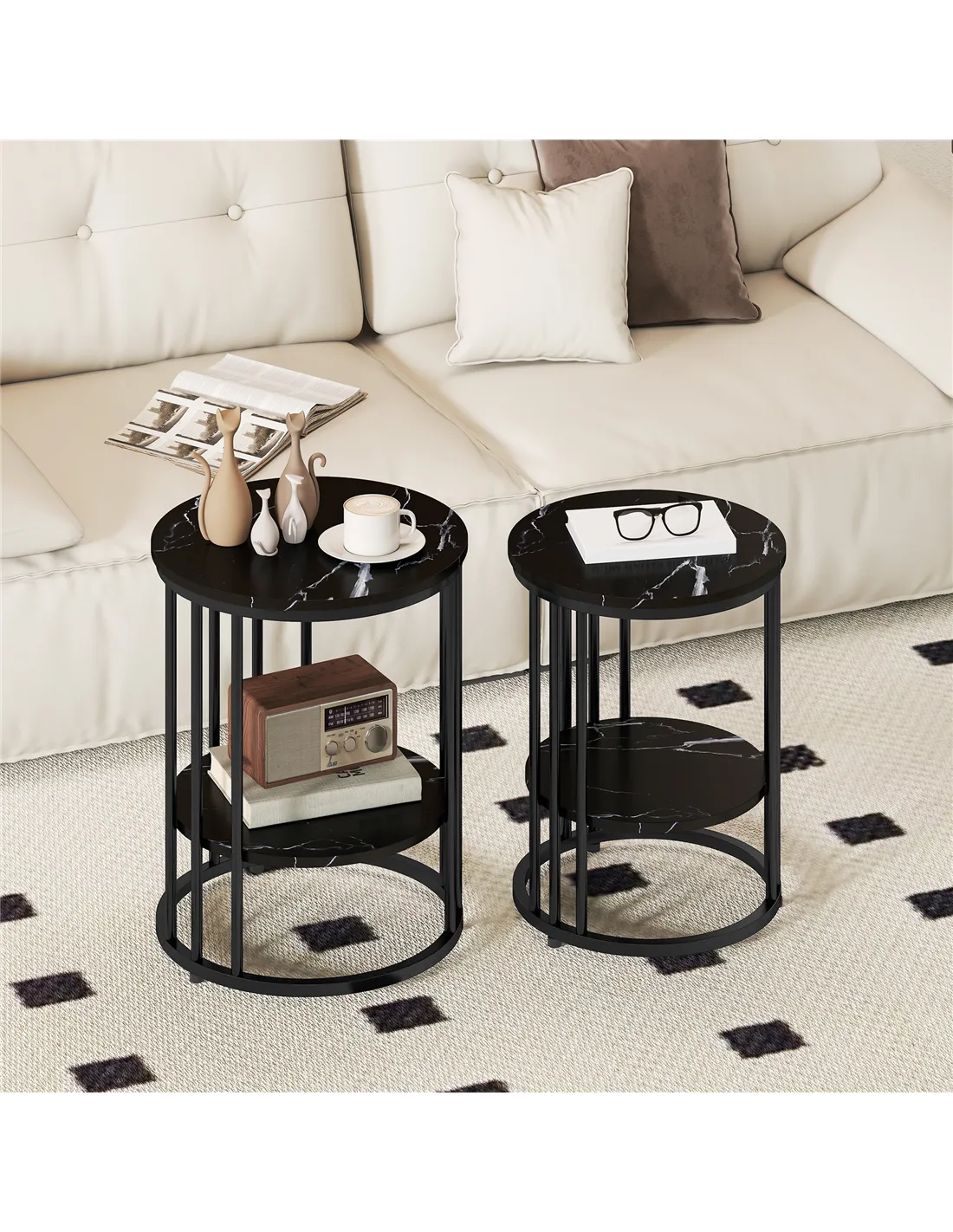- Marble-effect tabletops, with black legs for an elegant look