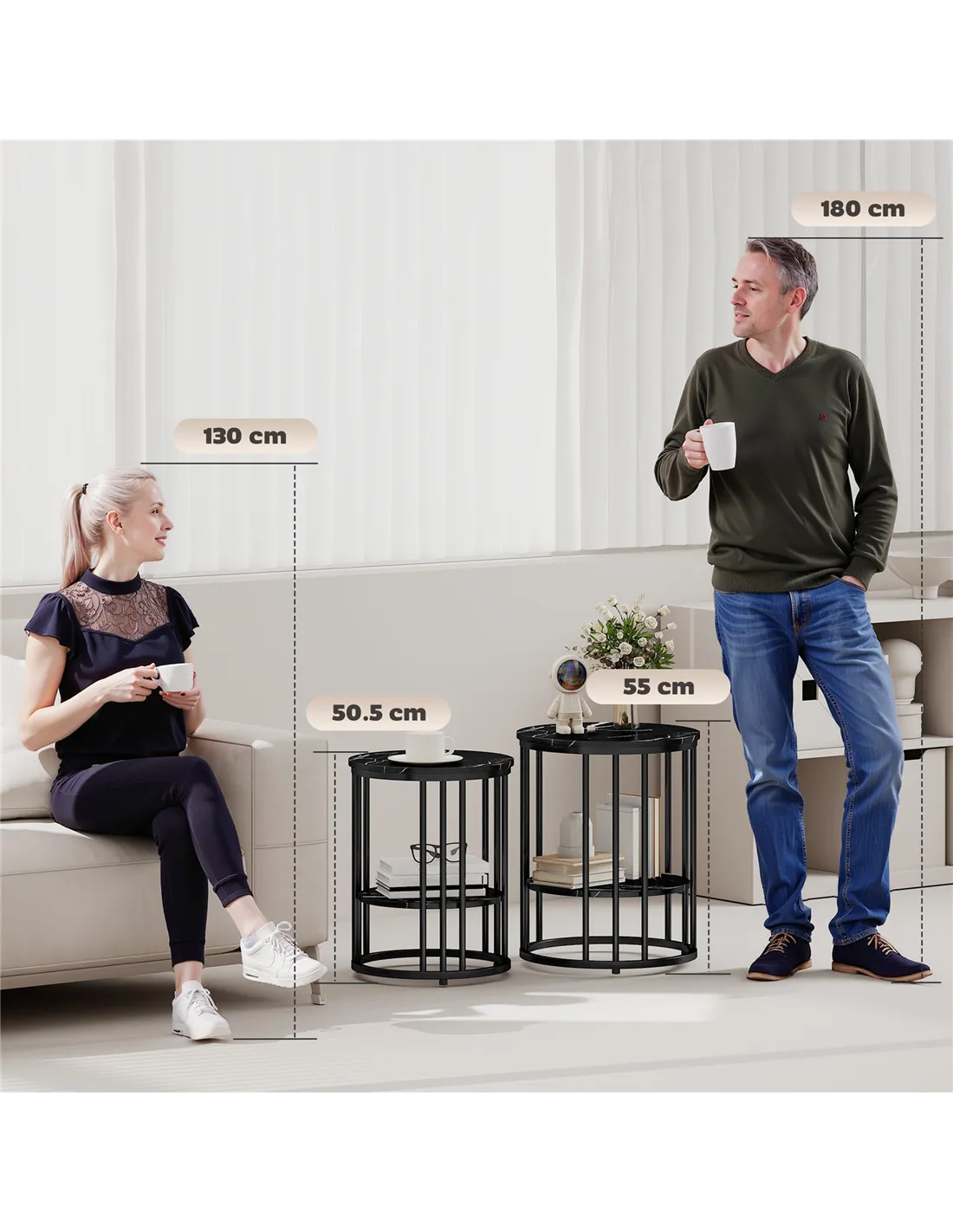 - A: The tables feature marble-effect MDF tops and a steel frame for durability.