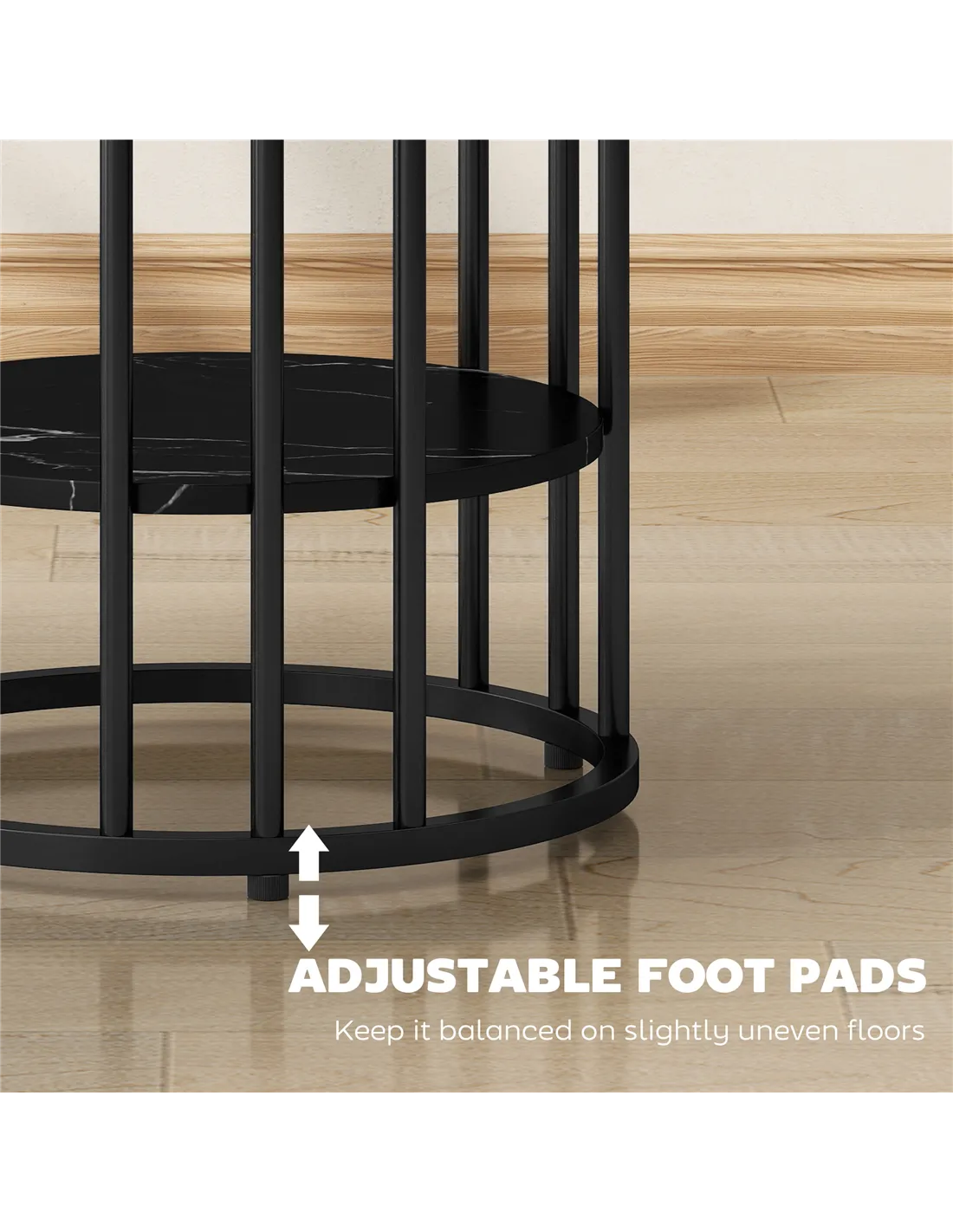 The HOMCOM Set of Two Marble-Effect Coffee Tables in Black elevates your living area. These two-tier tables deliver practical storage and display space. Each table presents an elegant marble-effect top with robust black steel legs. Steel frames provide a strong core. Adjustable feet ensure stability across different floor types. This set is a versatile addition to any home or office interior.