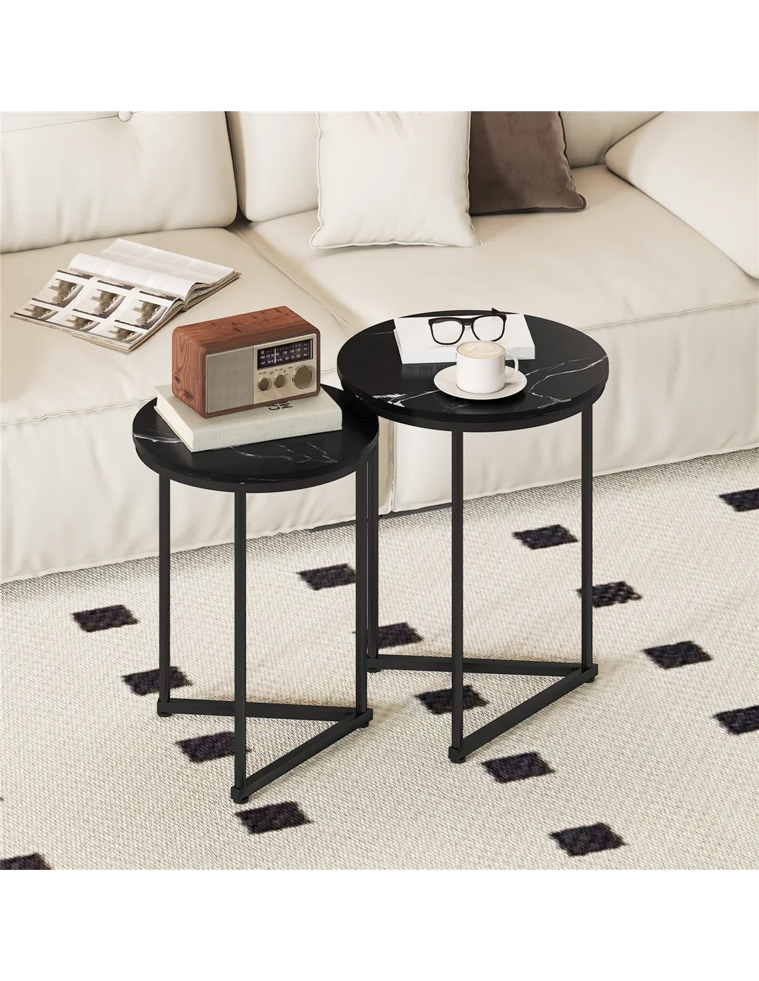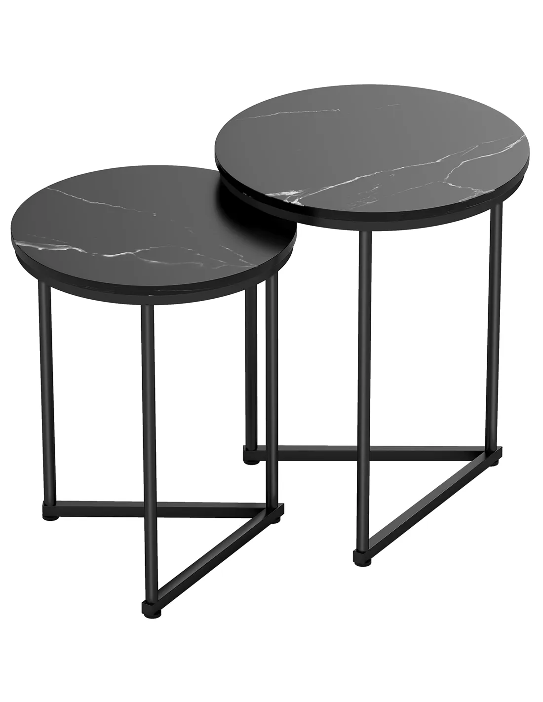 Enhance your UK home with the HOMCOM Set of Two Marble-Effect Nest of Tables. This versatile black marble effect nesting table set offers elegant design and practical functionality. You receive a large and a small table, providing adaptable surfaces for your lounge, hallway, or bedroom. Use them individually as side tables or together to extend your space. The tough MDF tabletops feature a sophisticated black marble effect, perfectly complemented by strong, powder-coated steel frames. This set adds a refined touch to any interior.