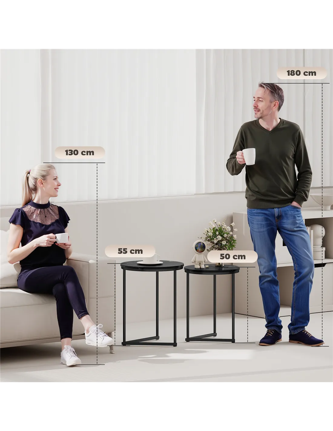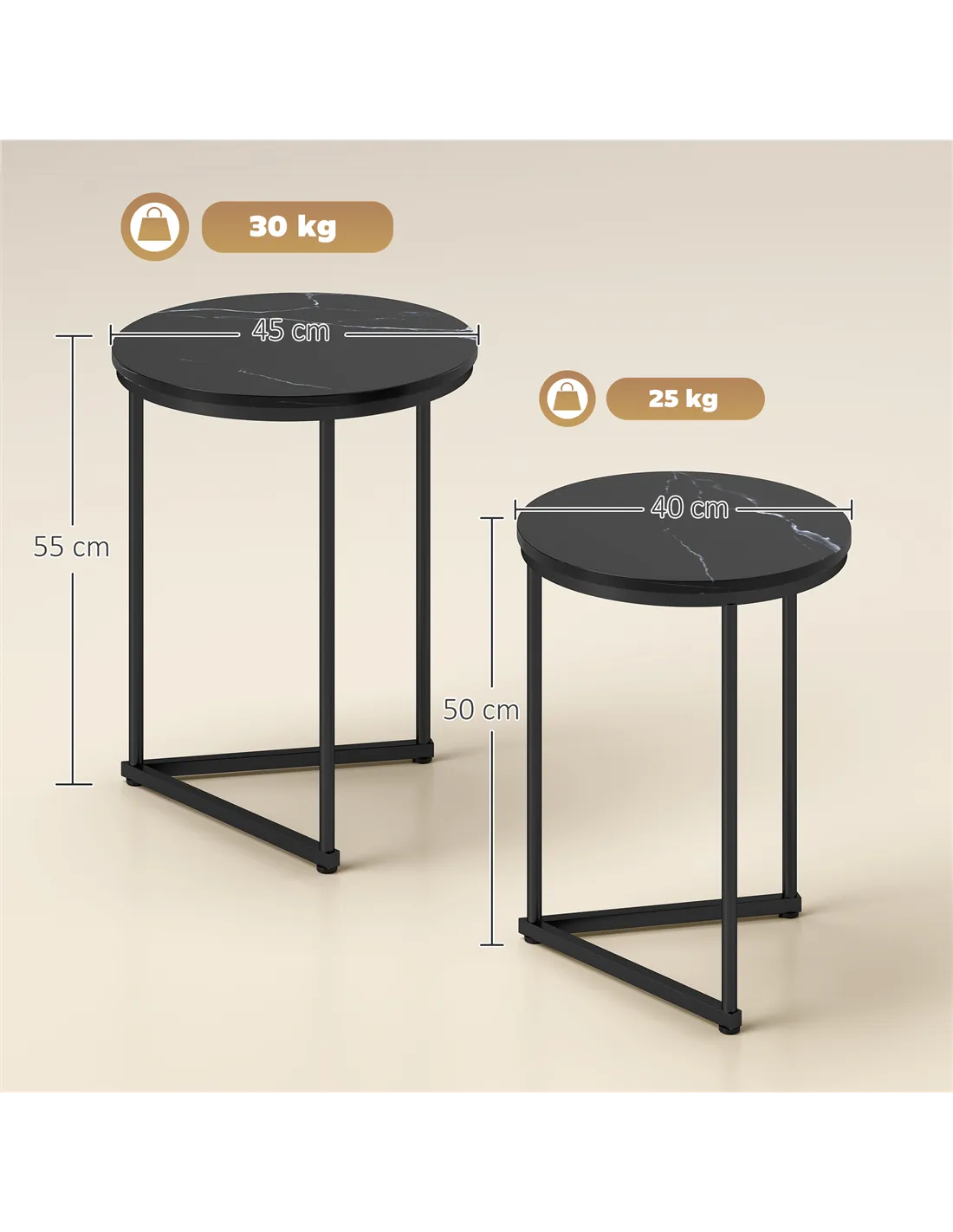 - A: The large table measures 45W x 45D x 55H cm. The small table measures 40W x 40D x 50H cm.