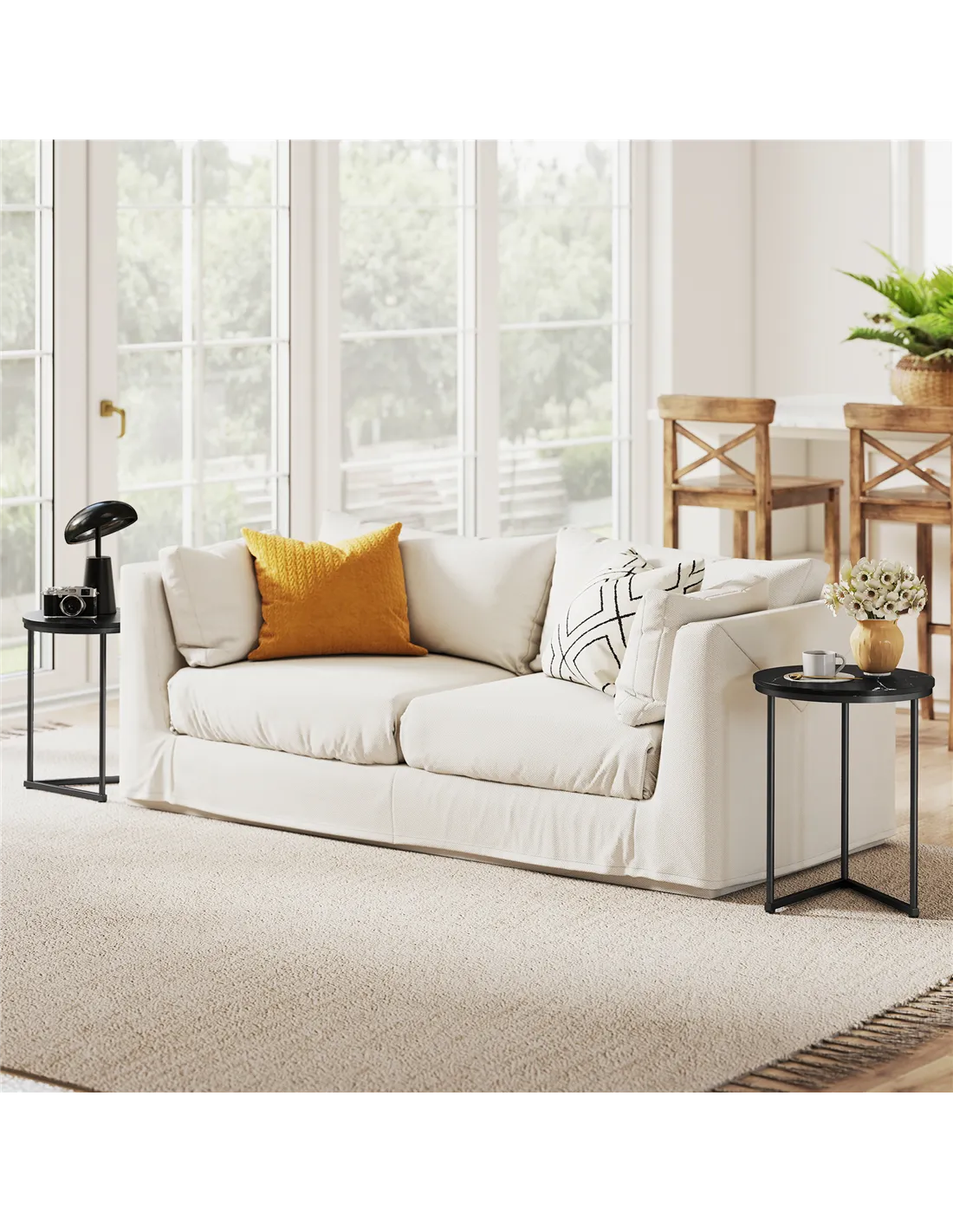 - Black marble-effect tabletops are elegant, complemented with the black frames