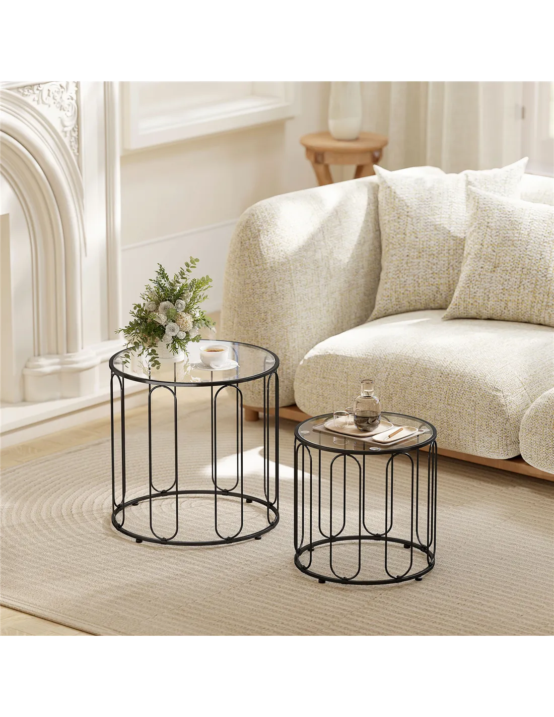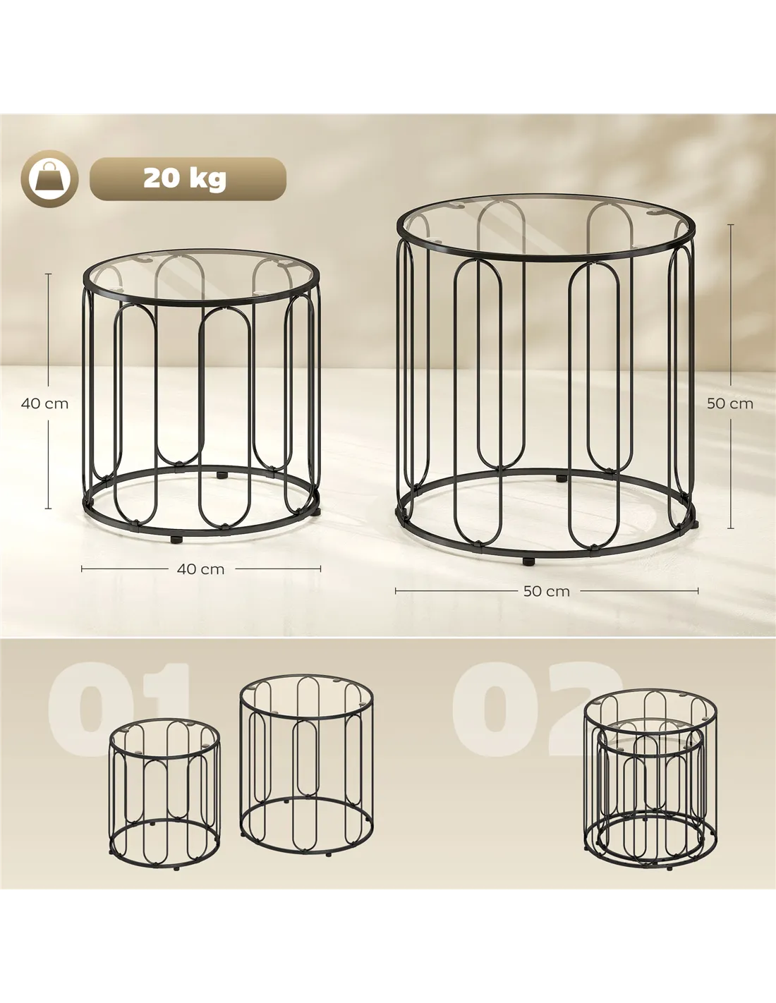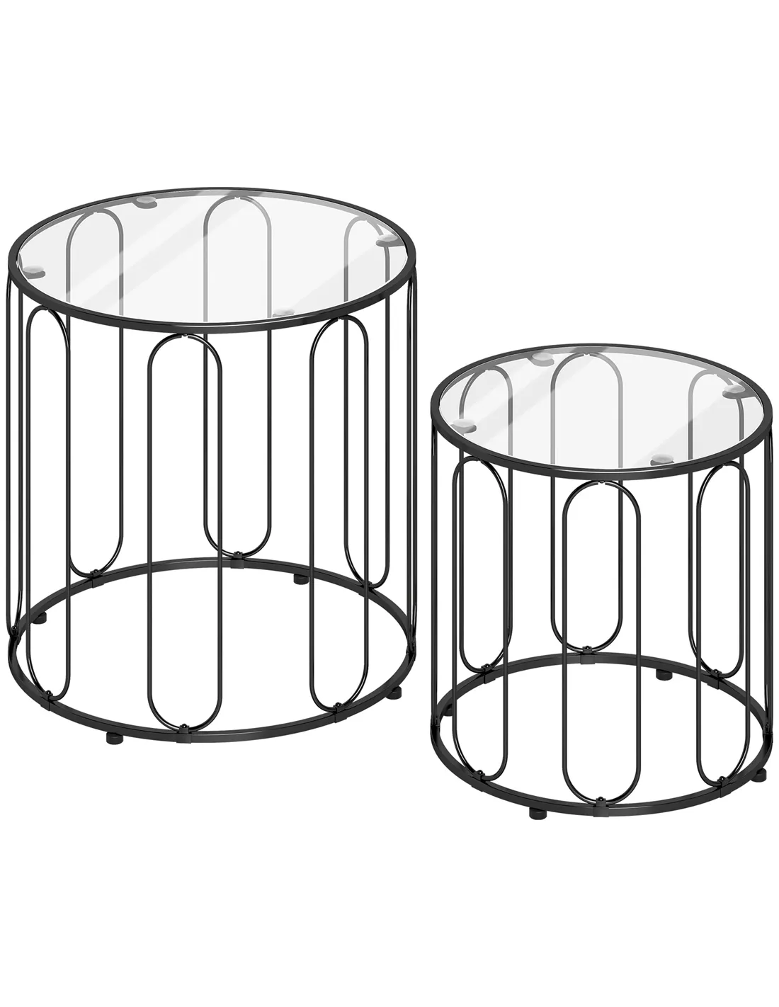 The HOMCOM Elliptical Cut-Out Nesting Tables in Black offer adaptable style and practicality for your home. This set includes two tables: a large Ø50 x 50H cm unit and a smaller Ø40 x 40H cm unit. Position them together for a dynamic, layered surface or spread them across different rooms for individual use. Each table features a robust elliptical metal ring frame and a secure tempered glass top. Adjustable foot pads provide stability on various floor types. These black nesting tables deliver a modern, bold aesthetic and a maximum weight capacity of 10 kg per table.