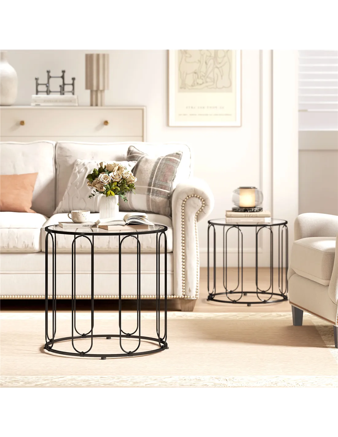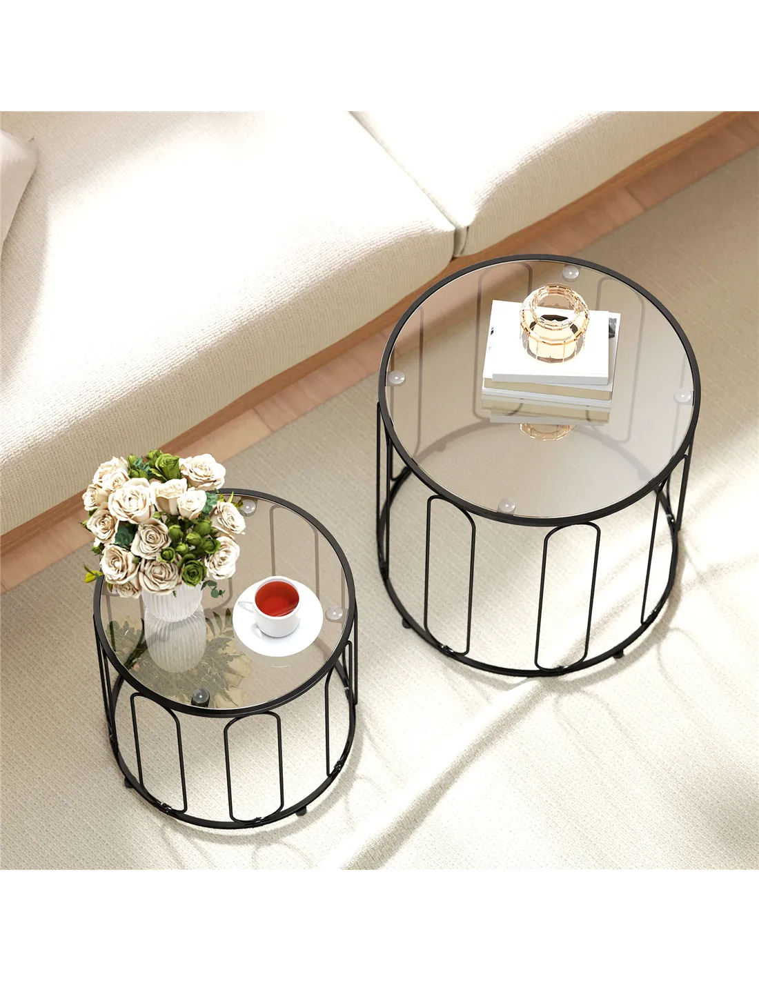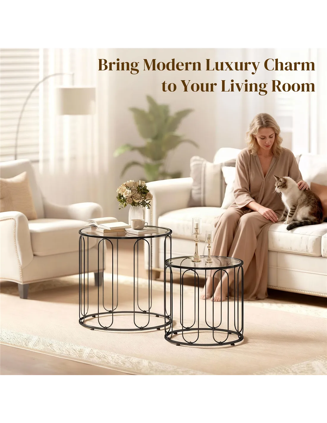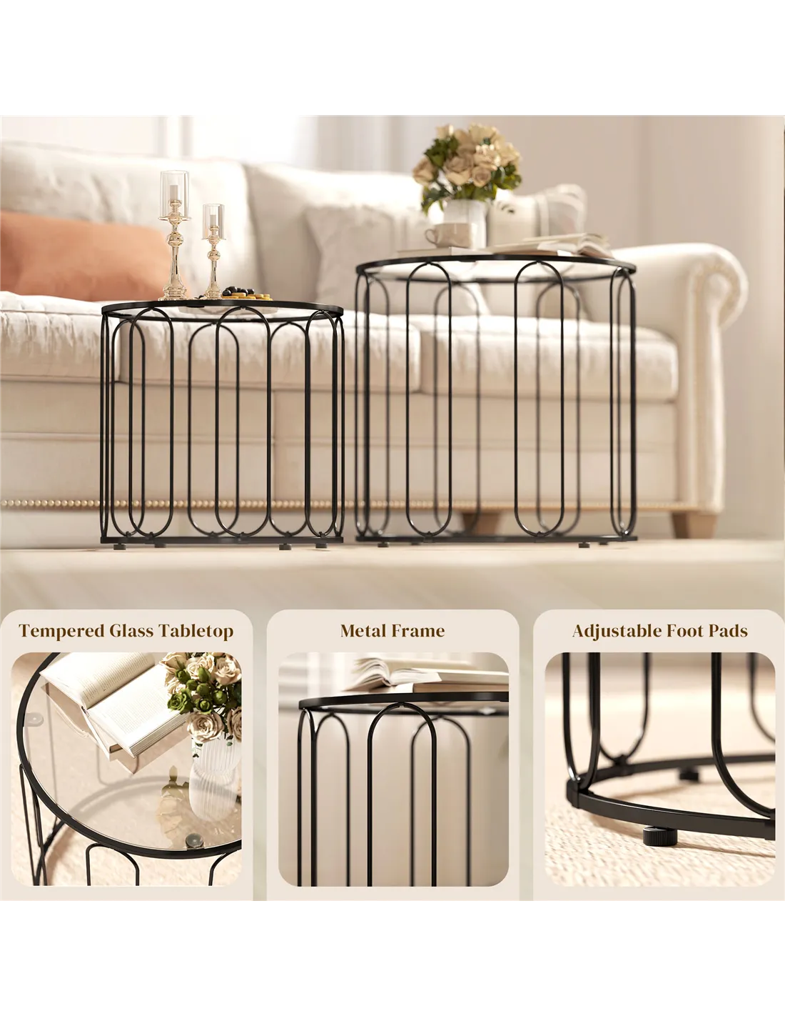 The HOMCOM Elliptical Cut-Out Nesting Tables in Black offer adaptable style and practicality for your home. This set includes two tables: a large Ø50 x 50H cm unit and a smaller Ø40 x 40H cm unit. Position them together for a dynamic, layered surface or spread them across different rooms for individual use. Each table features a robust elliptical metal ring frame and a secure tempered glass top. Adjustable foot pads provide stability on various floor types. These black nesting tables deliver a modern, bold aesthetic and a maximum weight capacity of 10 kg per table.