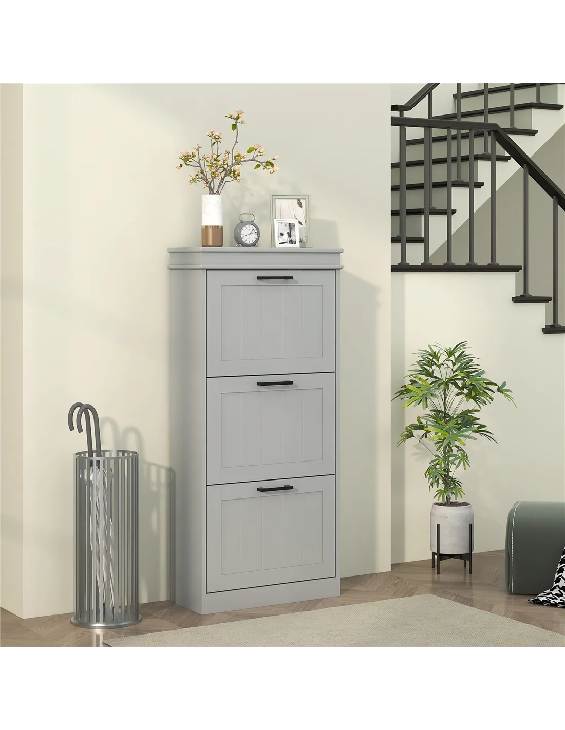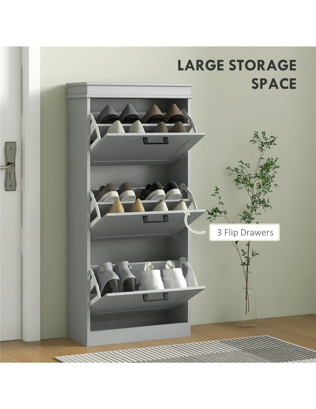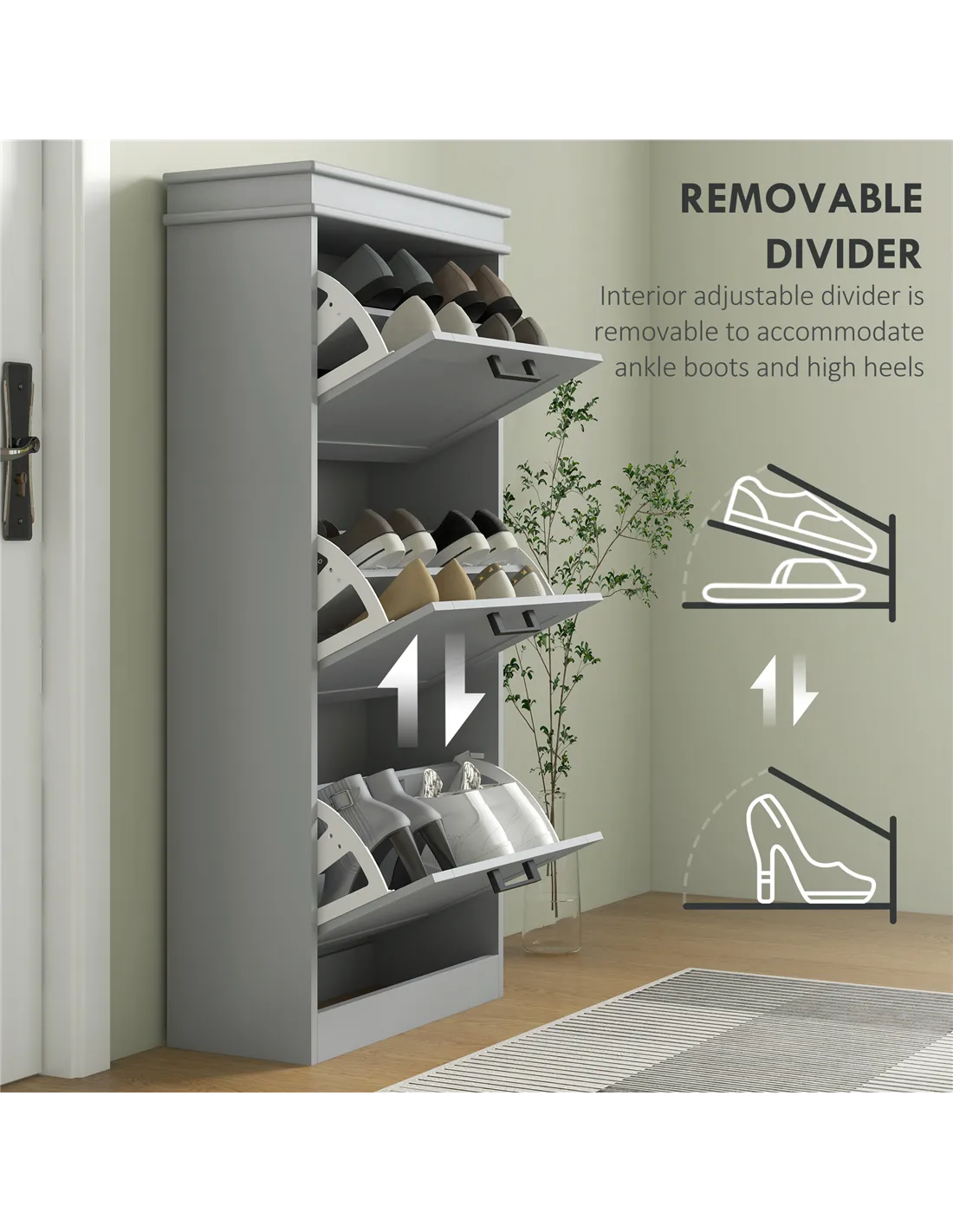 Bring organised storage to your home with the HOMCOM three-drawer minimalistic shoe cabinet in grey. This slimline unit offers a practical solution for narrow spaces within any UK residence, fitting discreetly into hallways or small rooms. It features three innovative flip drawers, designed to store up to 15 pairs of shoes. Each drawer contains two-level adjustable inner shelves, providing flexibility to accommodate diverse shoe sizes, including footwear up to UK 9.5. Crafted from durable MDF and finished with a smooth paint, this cabinet delivers a sturdy structure suitable for everyday demands. For your security, anti-tipping straps are included, ensuring secure wall mounting. This essential piece effectively manages your footwear collection while enhancing your home's organisation.