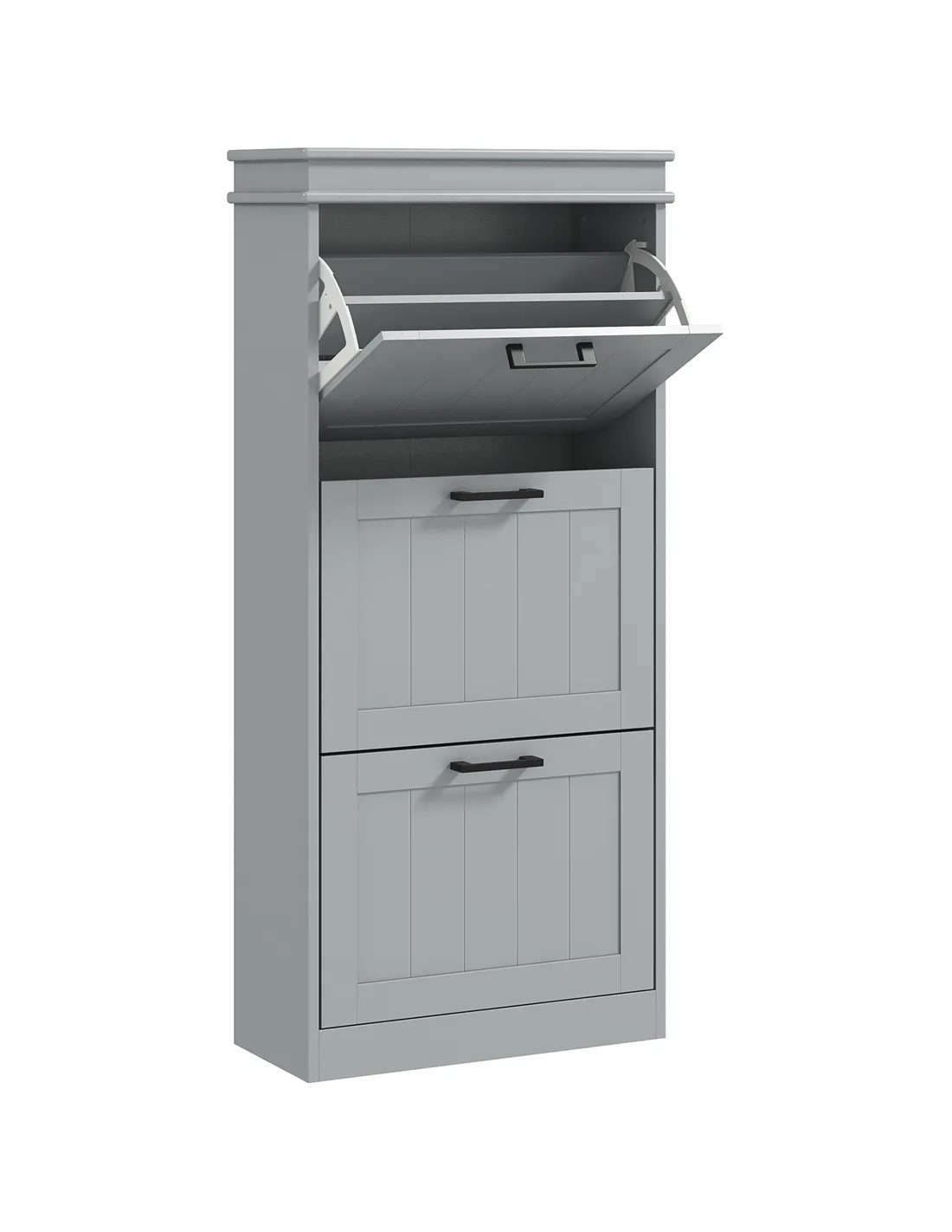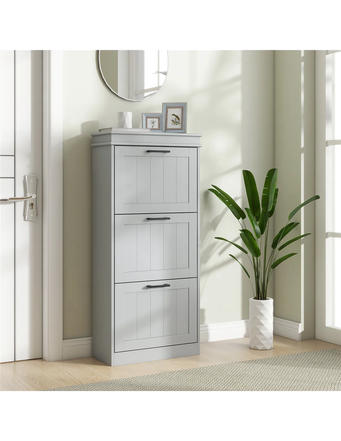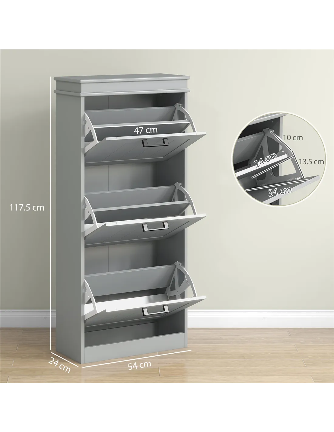 Bring organised storage to your home with the HOMCOM three-drawer minimalistic shoe cabinet in grey. This slimline unit offers a practical solution for narrow spaces within any UK residence, fitting discreetly into hallways or small rooms. It features three innovative flip drawers, designed to store up to 15 pairs of shoes. Each drawer contains two-level adjustable inner shelves, providing flexibility to accommodate diverse shoe sizes, including footwear up to UK 9.5. Crafted from durable MDF and finished with a smooth paint, this cabinet delivers a sturdy structure suitable for everyday demands. For your security, anti-tipping straps are included, ensuring secure wall mounting. This essential piece effectively manages your footwear collection while enhancing your home's organisation.