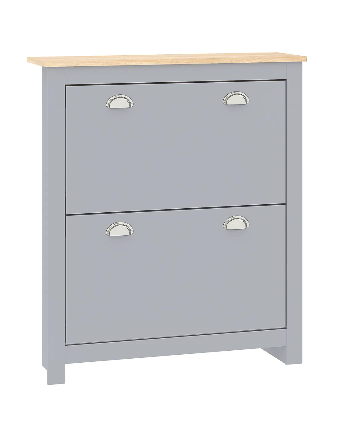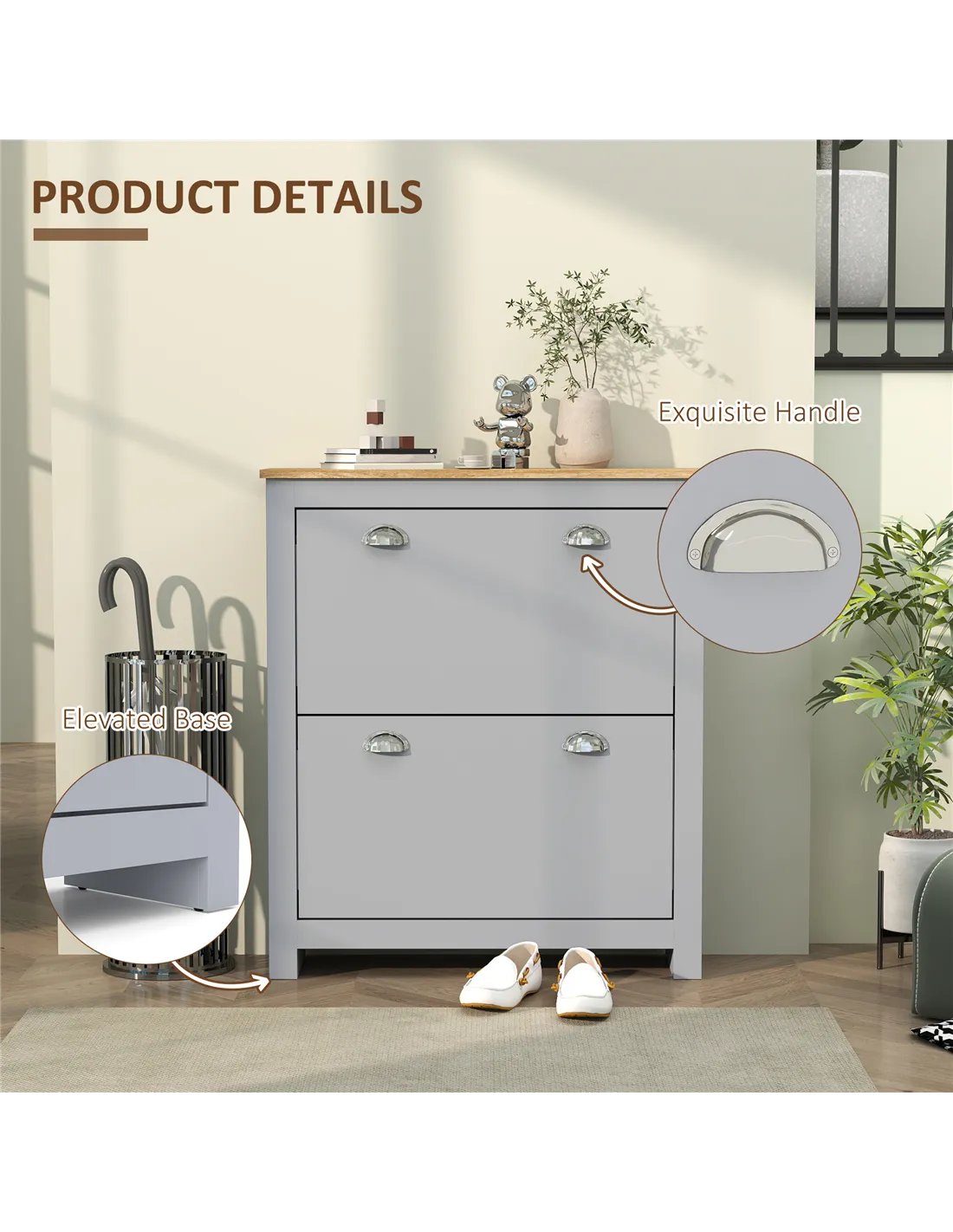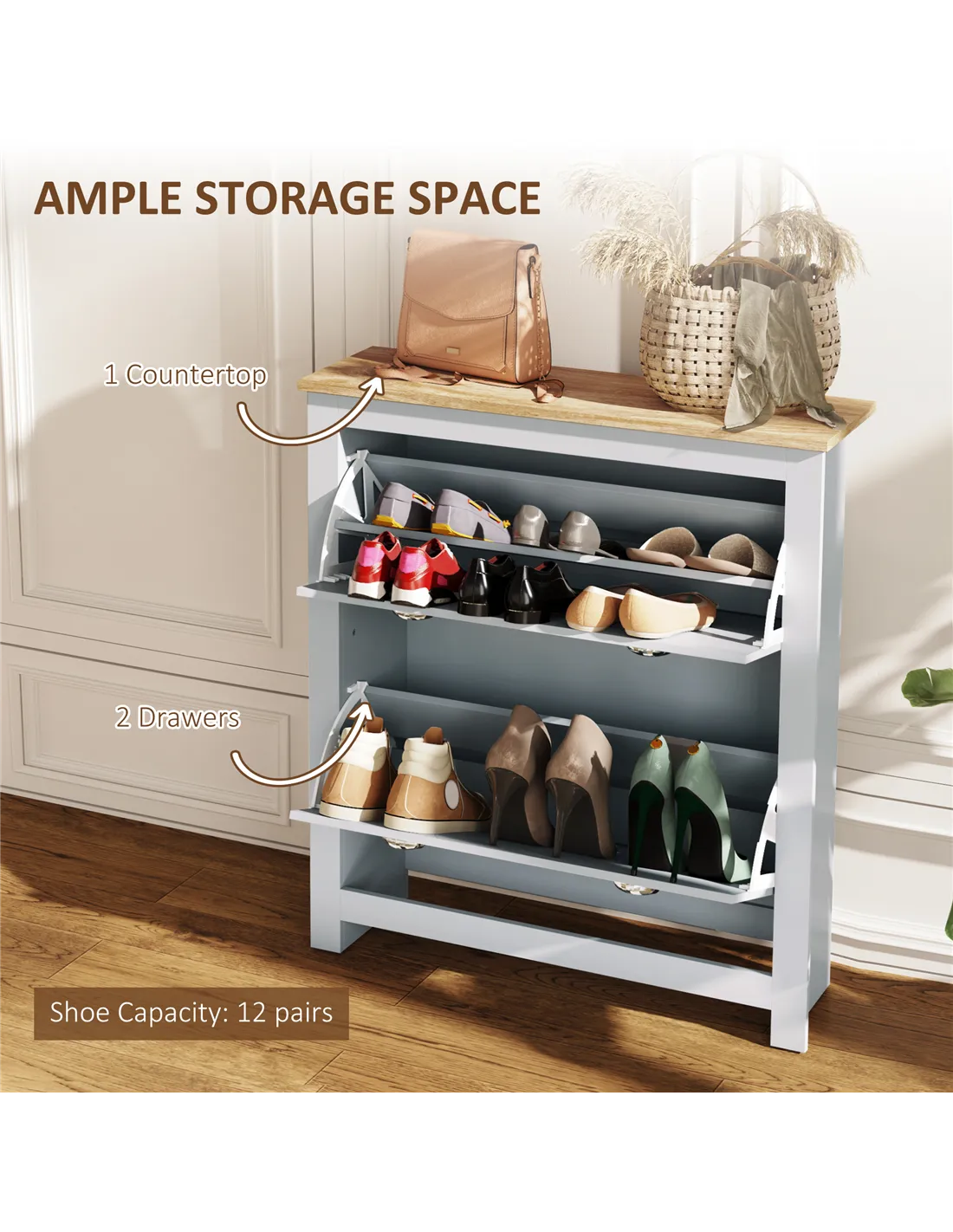 Bring order to your entryway with the HOMCOM 2 Drawer Shoe Cabinet. This modern, narrow shoe cupboard efficiently organises your footwear, keeping your hallway clutter-free. It features two tipping drawers, each containing an adjustable shelf. Store between 6 and 12 pairs of shoes, up to a UK size 10, within these compartments. Its slimline design saves floor space, an essential for British homes. The grey finish and clean, boxy shape complement diverse home interiors. A flat top shelf provides additional display or holding space. This wooden storage organiser combines practicality with a discreet aesthetic for your living environment.