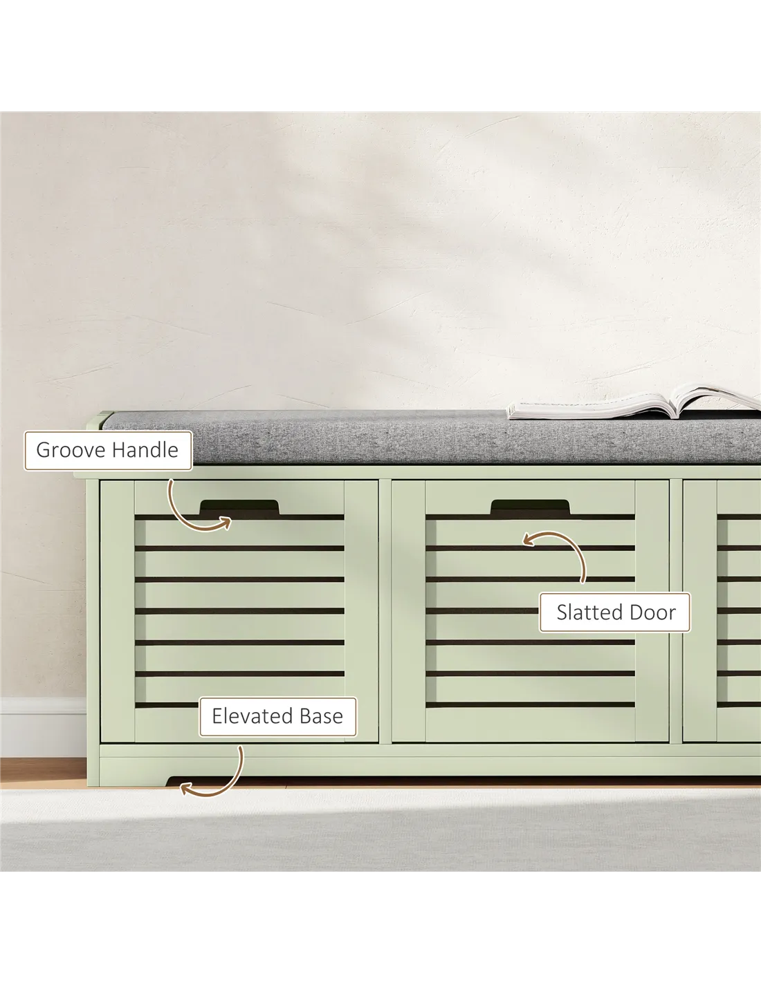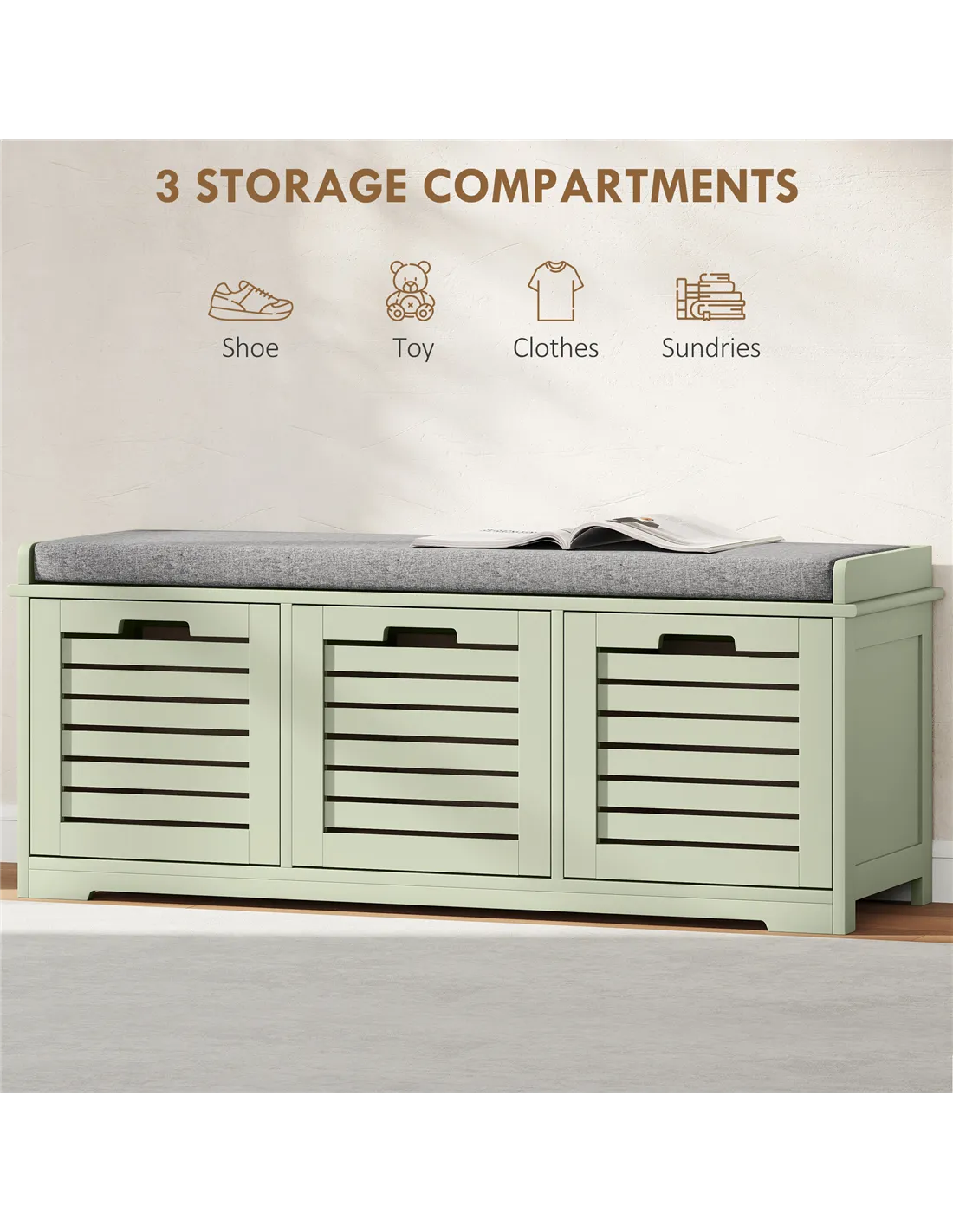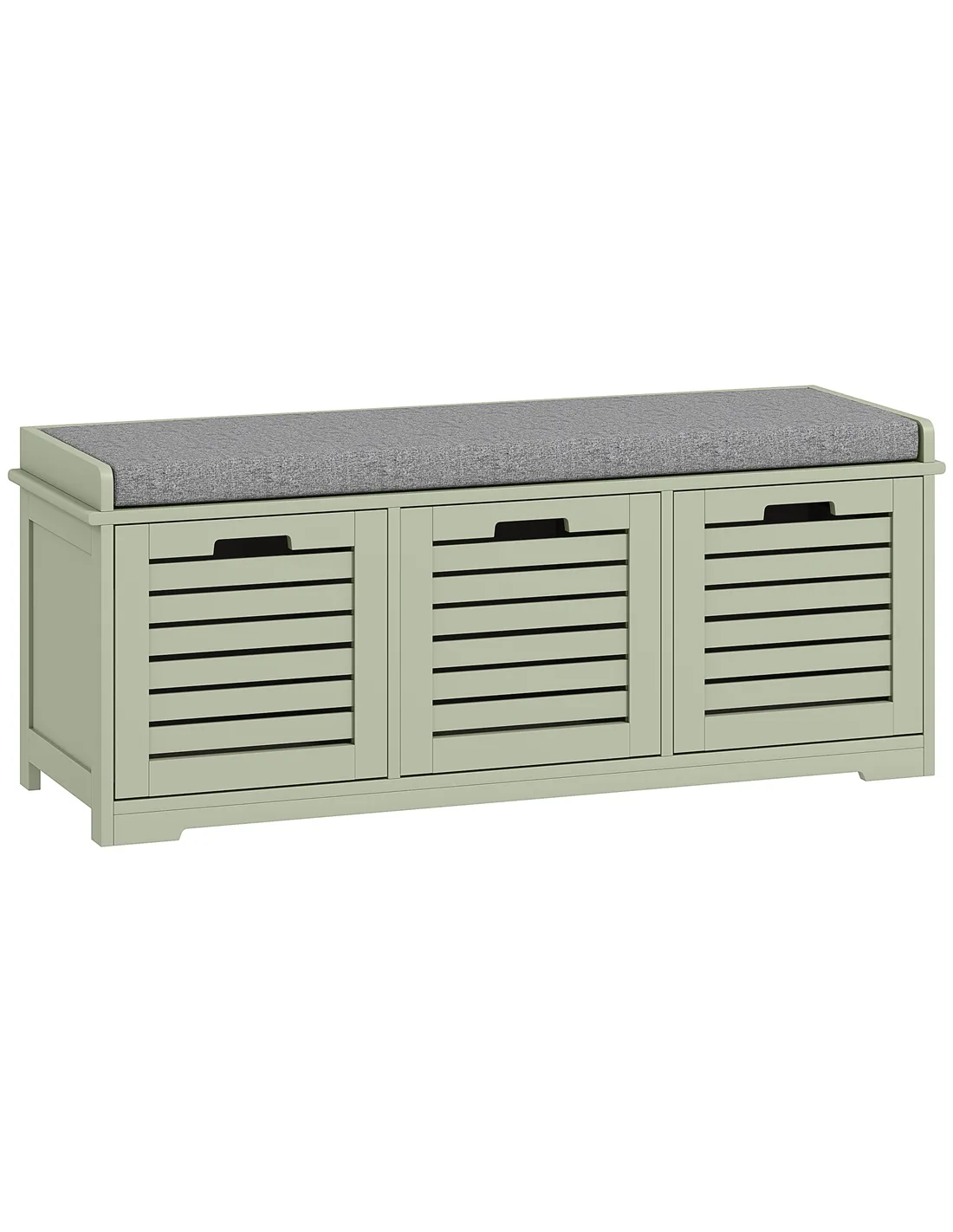 The HOMCOM 3-Drawer Shoe Storage Bench in Green offers a practical and stylish solution for shoe organisation in your UK home. This versatile furniture piece combines ample storage with comfortable seating. It features three spacious compartments, perfectly sized for shoes, trainers, and heels, keeping your entryway tidy. The robust MDF construction ensures stability and daily reliability. A padded top cushion, filled with comfortable sponge and wrapped in smooth, breathable linen, provides a convenient place to sit while putting on or taking off footwear. Slatted doors promote air circulation, maintaining freshness inside each compartment. The removable and washable linen cover ensures easy maintenance. This bench supports a maximum load of 160 kg. Its compact dimensions (43H x 108W x 35D cm) fit various spaces, making it an ideal addition to your hallway or utility room.