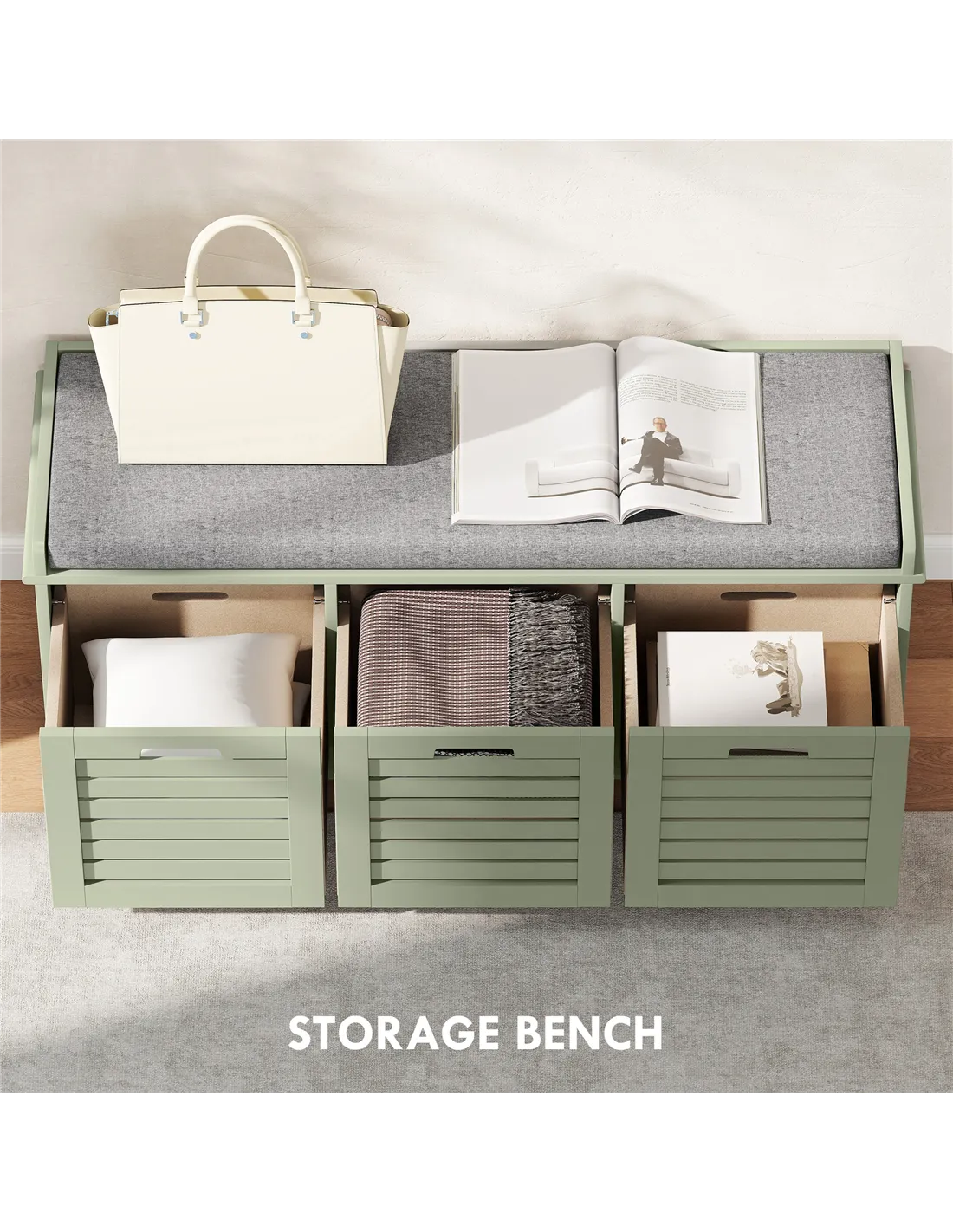 - A: The overall dimensions of the bench are 43H x 108W x 35D cm. Each inner drawer measures 22H x 30W x 30D cm.