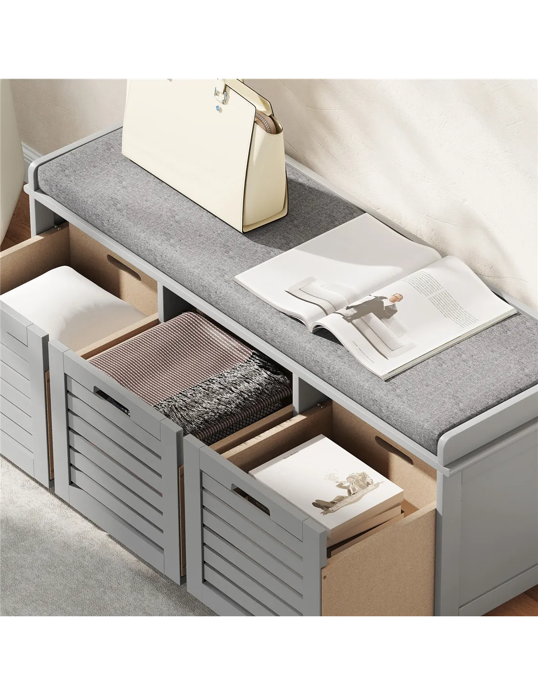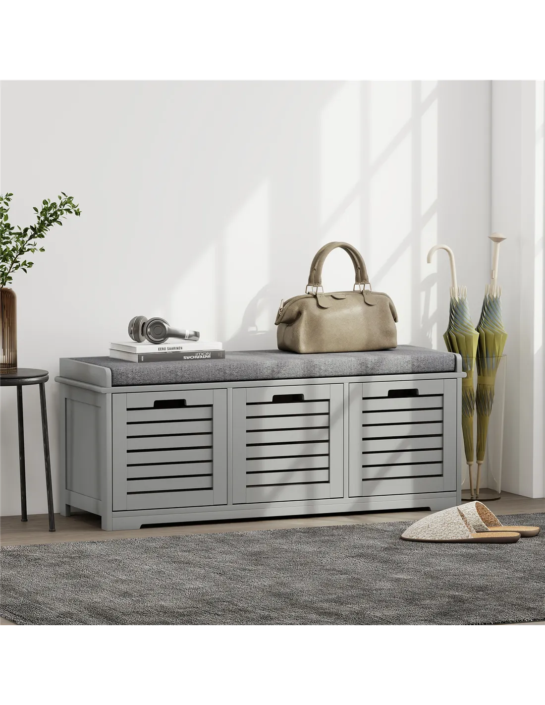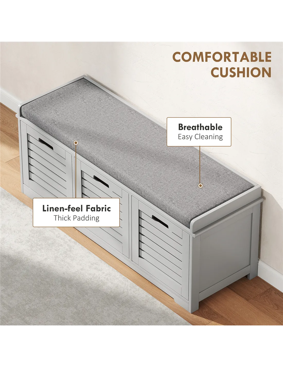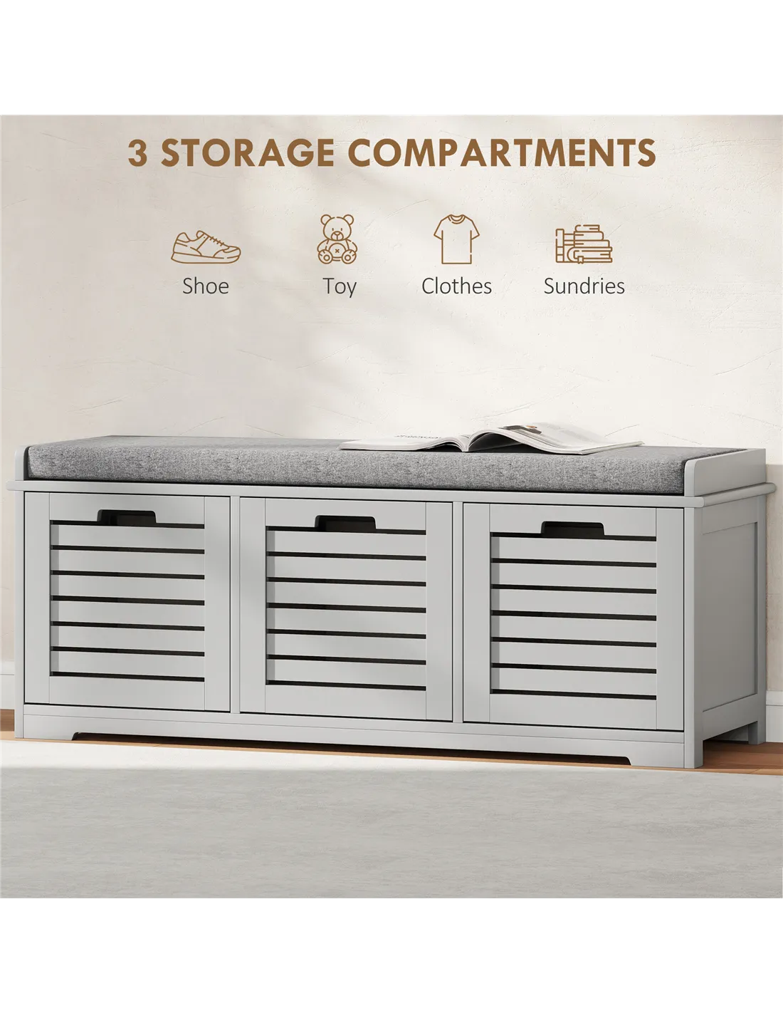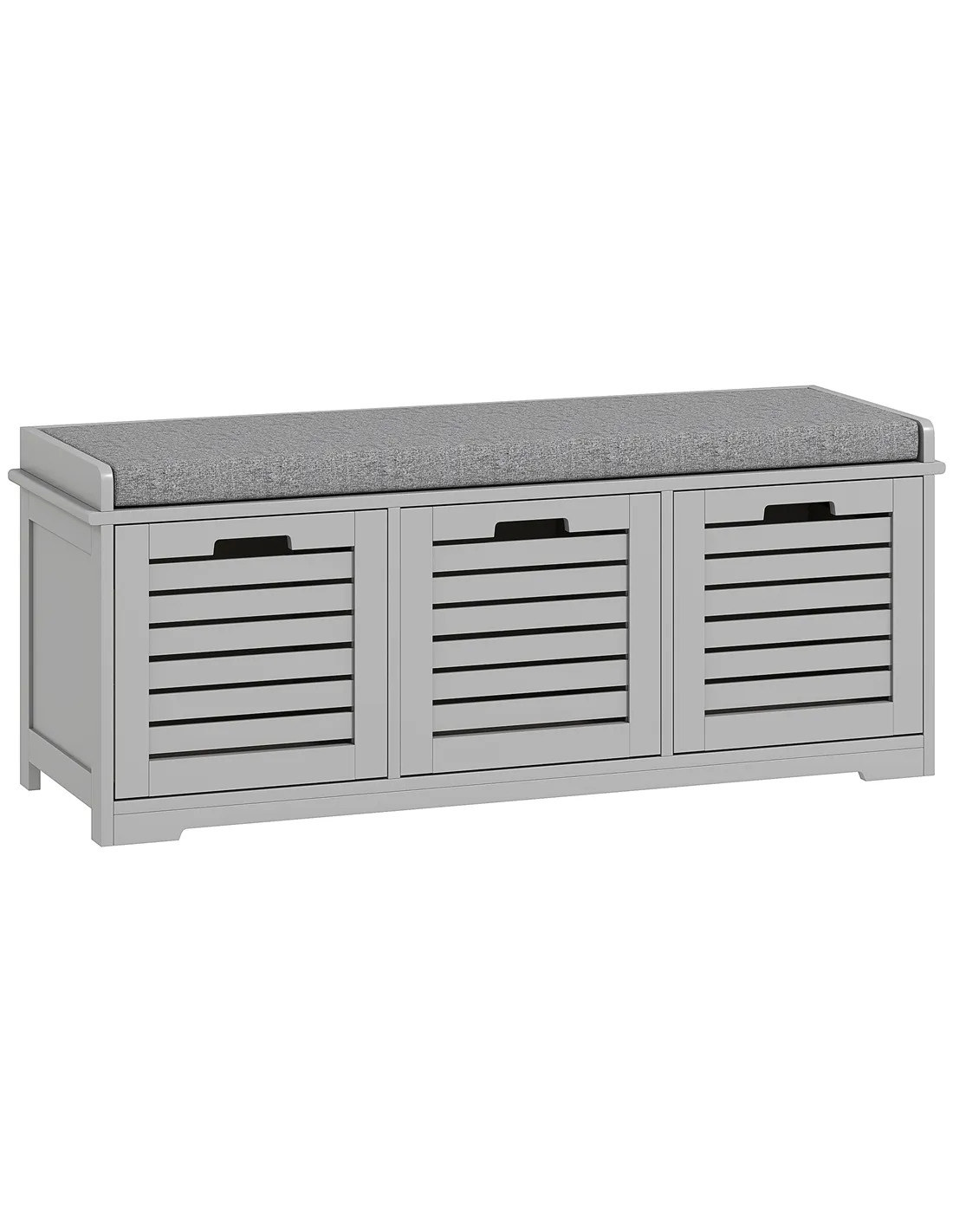 The HOMCOM 3-Drawer Shoe Storage Bench in Grey offers a practical and stylish solution for your home's entryway or hallway. This versatile unit combines efficient shoe storage with comfortable seating. It features three spacious compartments, expertly designed to accommodate your shoes, trainers, and heels, keeping your living space tidy and clutter-free. The robust MDF construction ensures stability and daily reliability. A padded top cushion provides a comfortable spot to sit while putting on or taking off footwear. This cushion, wrapped in smooth, breathable linen, is also easy to wipe clean. Slatted doors promote air circulation, maintaining freshness within each compartment. Low corner feet elevate the unit, completing its smart, functional design.