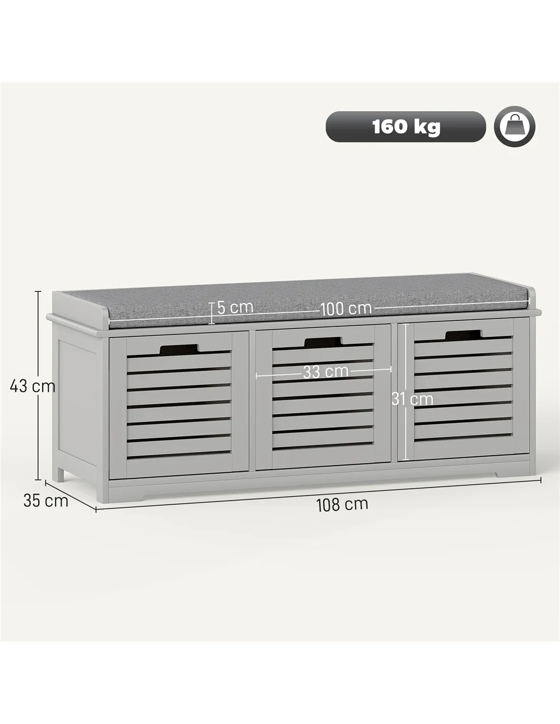 - A: The HOMCOM 3-Drawer Shoe Storage Bench has a maximum load capacity of 160 kg.