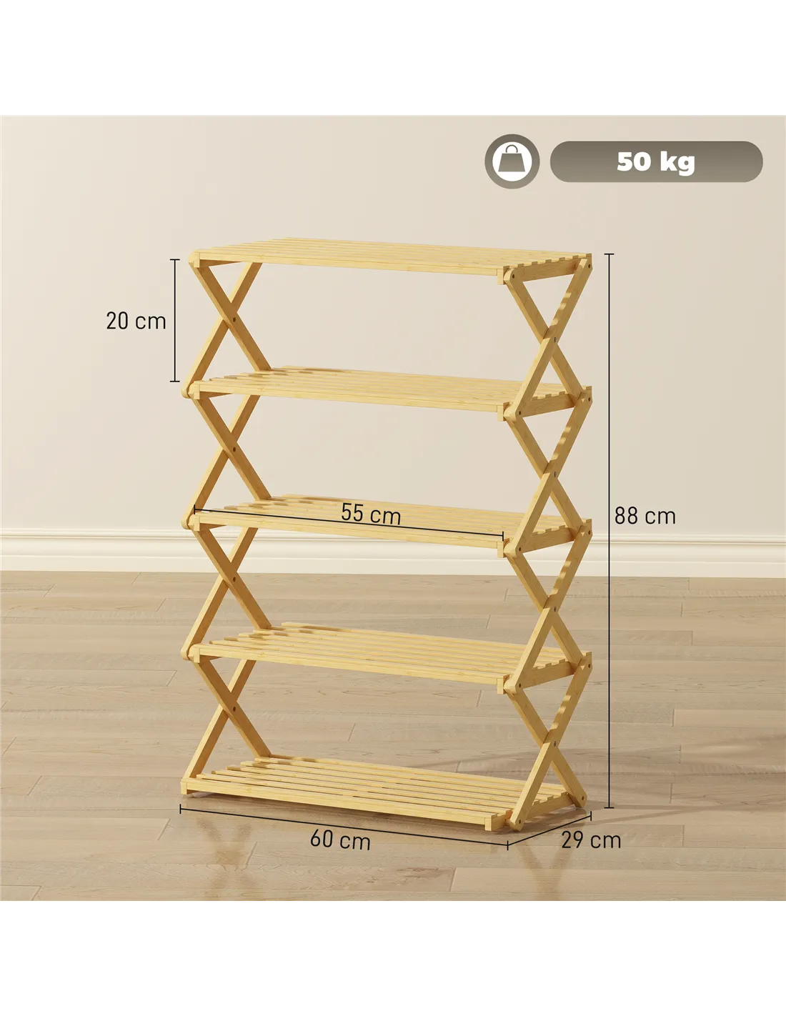 Organise your footwear efficiently with the HOMCOM Five-Tier Folding Bamboo Shoe Rack. This practical storage solution features five robust shelves, accommodating up to 15 pairs of shoes. You will find ample space for your boots, trainers, and heels. Constructed from natural bamboo, this rack offers both strength and an attractive appearance for your home. A clear varnish finish provides light protection, ensuring durability for daily use. Its clever foldable design means you unpack it and fix it into shape easily, ready for immediate use. When not needed, fold it away for convenient storage. This rack supports a total load of 50 kg, with each shelf holding up to 10 kg. It accommodates shoe sizes up to UK 9. Slatted shelves promote air circulation, keeping your footwear fresh. The natural finish complements various interior styles.