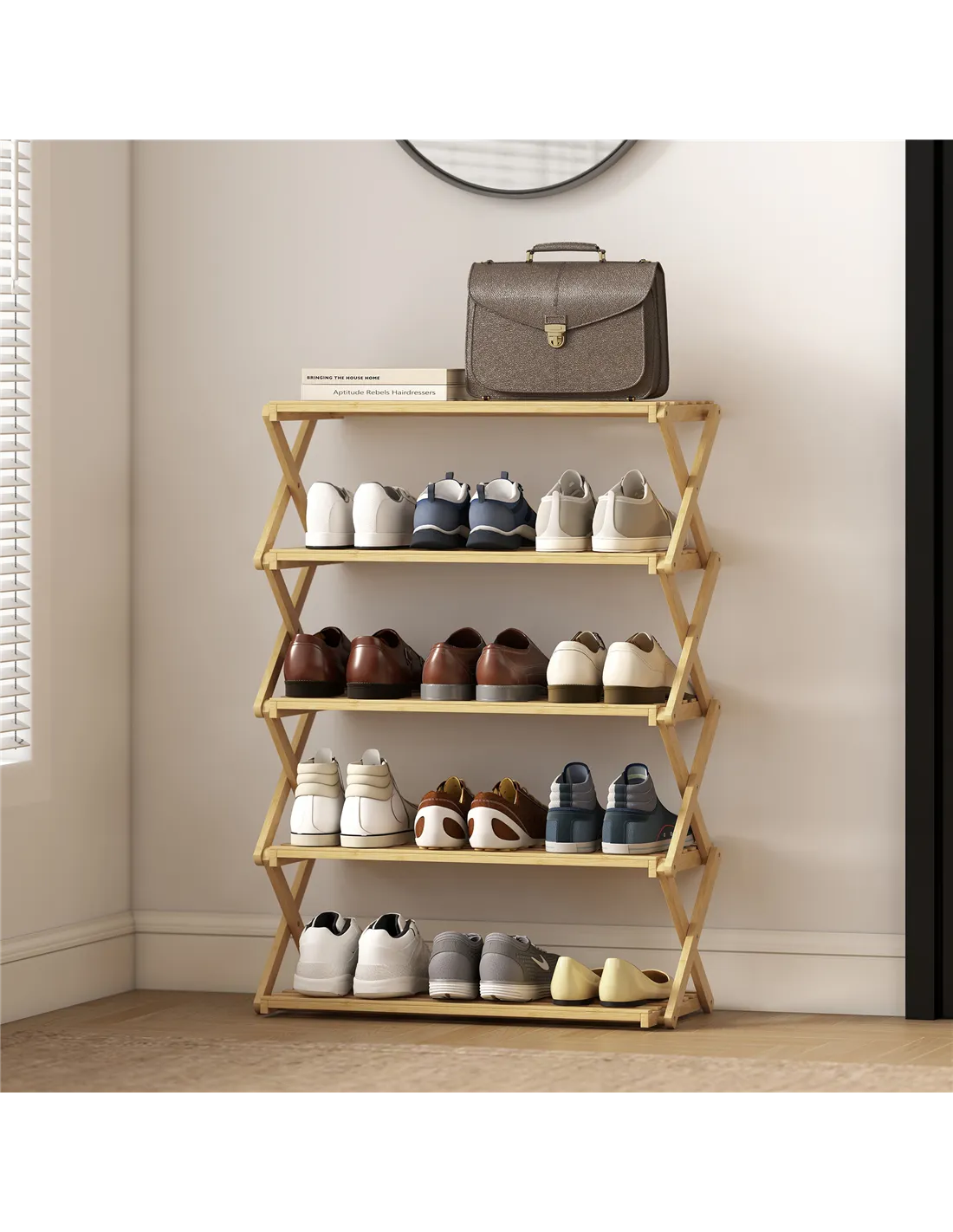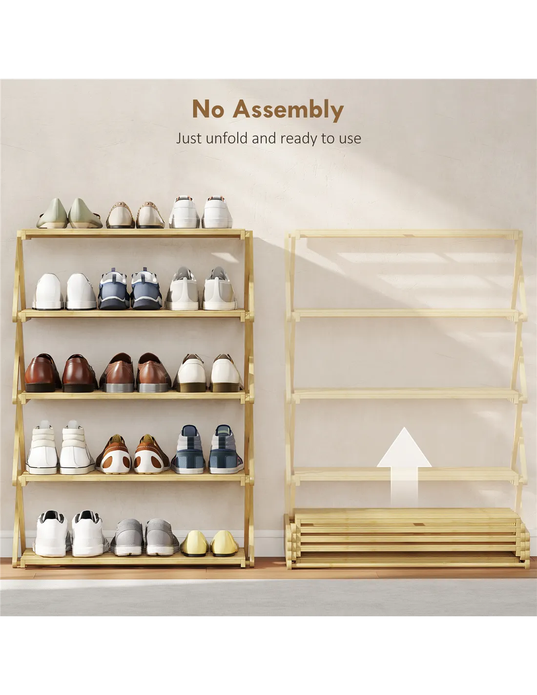 - A: No, the HOMCOM Five-Tier Folding Bamboo Shoe Rack arrives fully assembled. You unpack it and fix it into shape for immediate use.