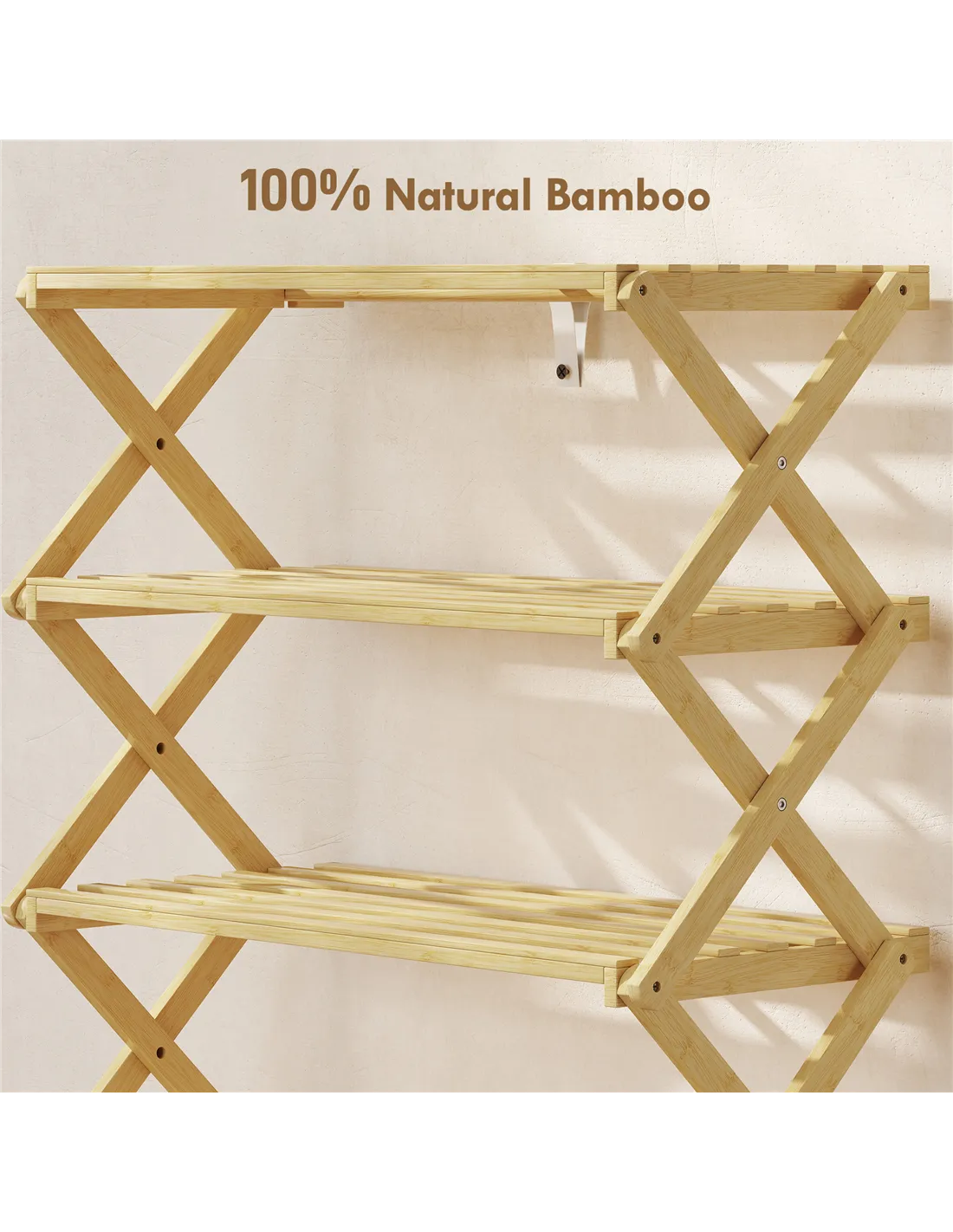 - A: This shoe rack is constructed from strong, natural bamboo. It features a clear varnish finish for light protection and durability.