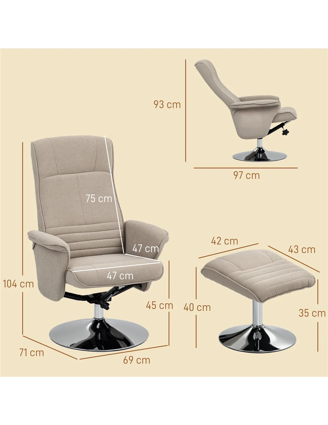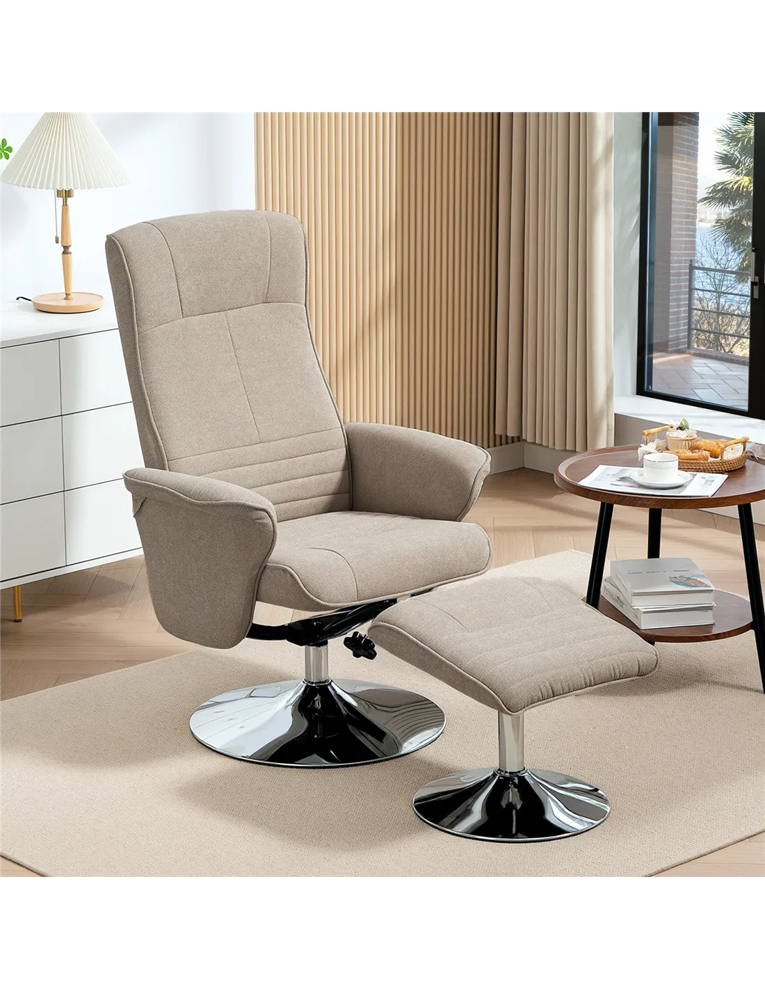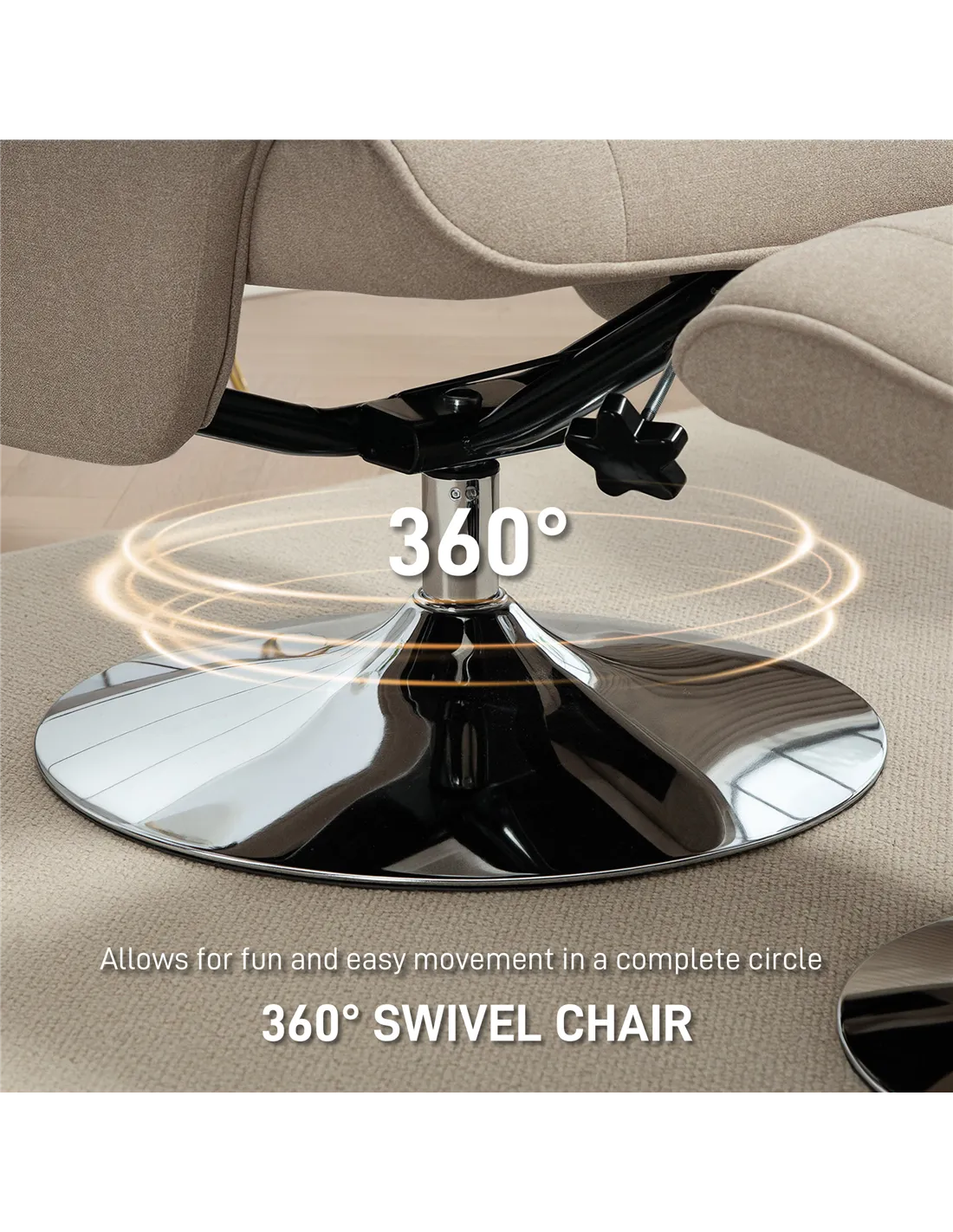 Experience ultimate comfort with the HOMCOM Swivel Recliner Chair and coordinating Footstool. This beige velvet-feel armchair offers a luxurious retreat for any living room, bedroom, or office. Its plush upholstery and thick foam padding provide superior support, making it ideal for daily relaxation. Recline manually up to 135 degrees to find your perfect position for reading, napping, or watching television. The 360-degree swivel feature allows easy rotation, providing full control of your space. Built on an electroplated steel frame, this upholstered recliner ensures lasting durability and a stable seating experience. The soft velvet-feel fabric adds warmth and a cosy touch to your home decor. This set delivers a comfortable and stylish solution for unwinding after a long day.