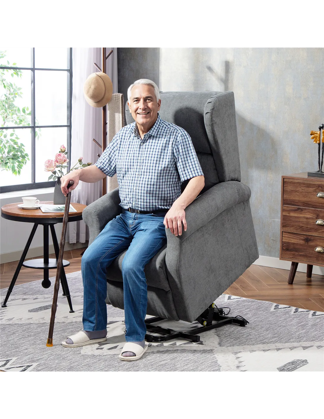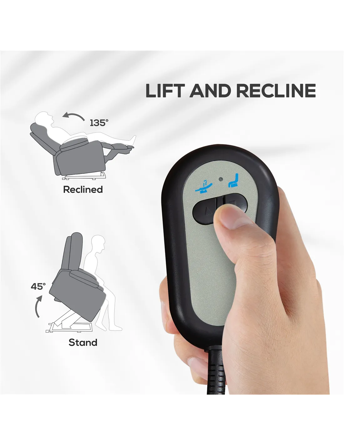 - A: The chair is powered by electricity and controlled via an attached remote control. This remote manages both the 135° reclining back with footrest and the 45° lifting function.
